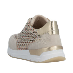 Rieker sneakers til dame i beige. Elegante sneakers med et moderne og velafbalanceret look, der kombinerer stil og komfort. Snørebåndene gør det let at tilpasse skoen til foden og sikrer en behagelig pasform. Indvendigt finder du en blød udtagelig indersål, som giver god komfort gennem hele dagen. Den mønstrede ydersål giver både øget stødabsorbering og skridsikkerhed i hverdagen.