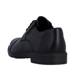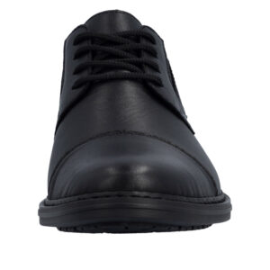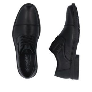 Rieker sko til herre i sort. Denne klassiske skindsko til herre er et godt valg, hvis du ønsker en kombination af funktion og komfort i hverdagen. Skoen har snørebånd og elastik, der gør den nem at komme i og af og giver en behagelig pasform. Indvendigt mødes du af en blød sål og ekstra bredde (H), som sikrer rummelighed og komfort hele dagen. Ydersålen med mønster giver øget stødabsorbering og skridsikkerhed, så hvert skridt føles mere behageligt.