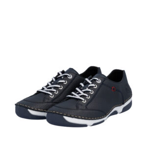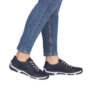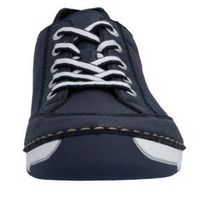 Rieker sneakers til dame i mørkeblå. Fleksibel sneakers i en mørkeblå farve med diskrete detaljer og en tekstureret skindoverdel som giver et stilfuldt look. Foran har skoen snørebånd der gør det muligt at justere pasformen efter behov. Indvendigt mødes du af en blød skindsål der sikrer optimal komfort hele dagen. Den velkendte Rieker sål er stødabsorberende og udstyret med et mønster som giver god støtte og øget skridsikkerhed.