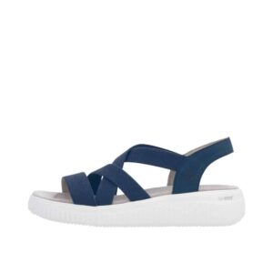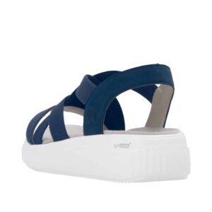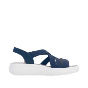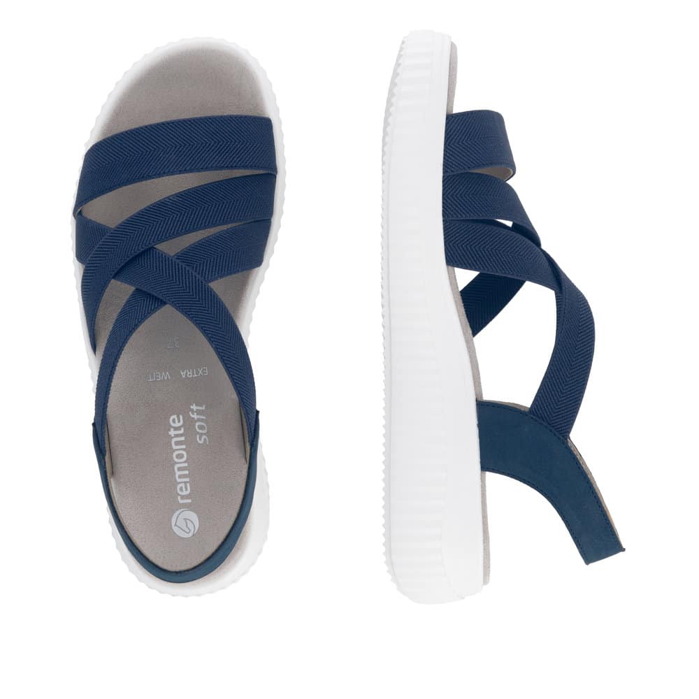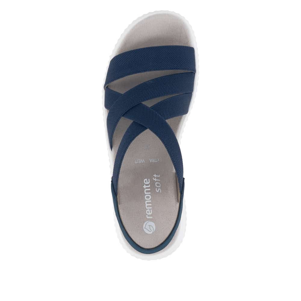 Remonte sandal til dame i blå. Sandalerne har elegante elastiske remme, der kombinerer et flot udseende med praktisk funktionalitet. Den bløde indersål med Remonte Soft sikrer komfort hele dagen, og den ekstra bredde H giver mere plads til foden. Ydersålen er stødabsorberende og giver god støtte.
