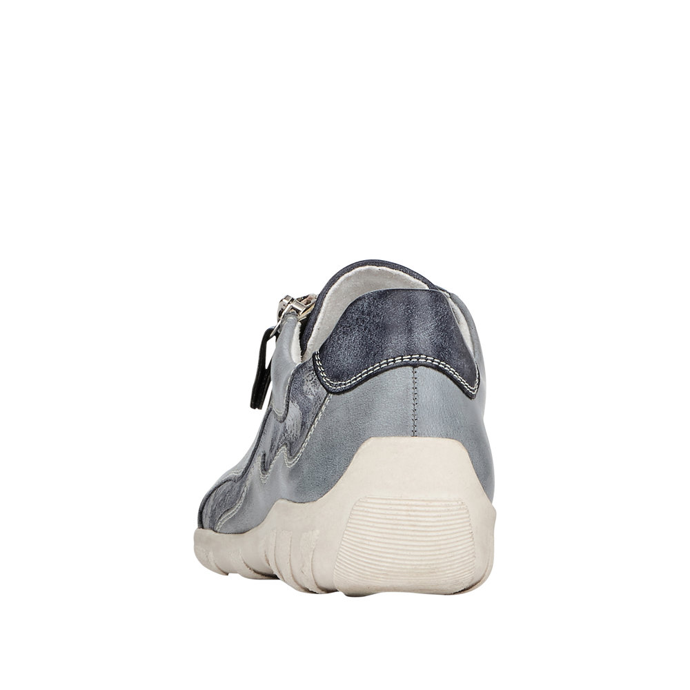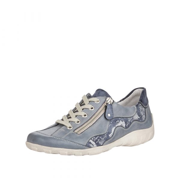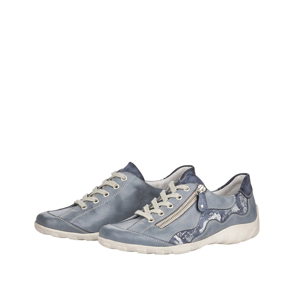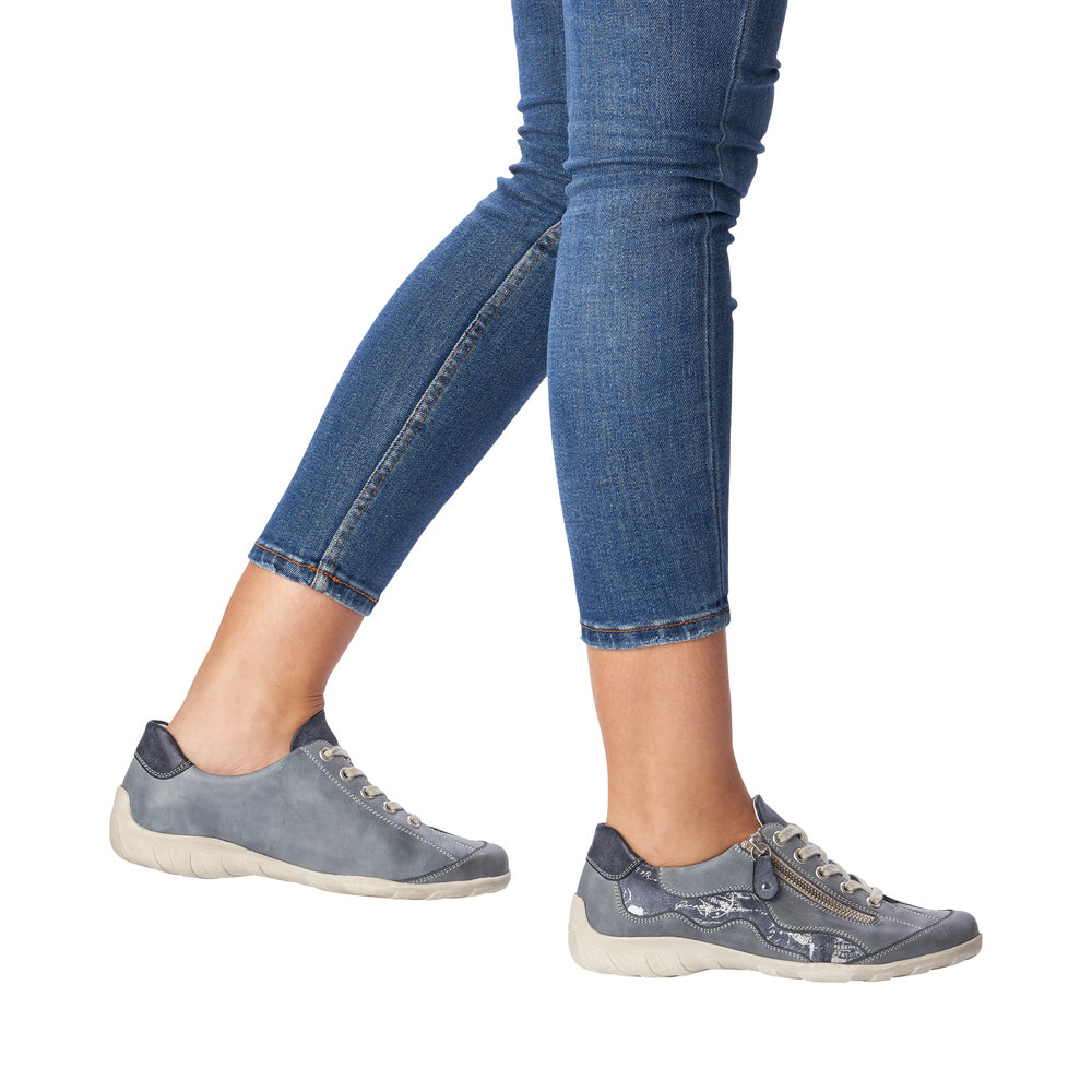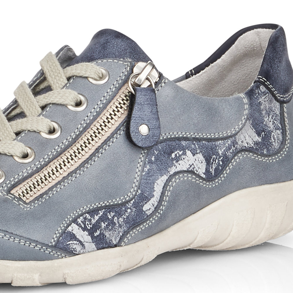 R3416-14 Remonte Sneakers i Blå til Dame. Super fin sneakers fra Remonte, i den fineste blå farve med mange flotte detaljer. Modellen har en lækker skindoverflade, samt udtagelige såler. Modellen har snøre samt lynlås, som gør den nem at komme i/af.