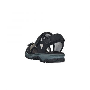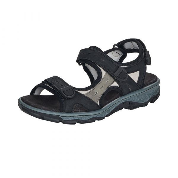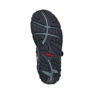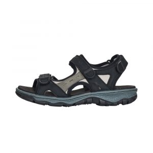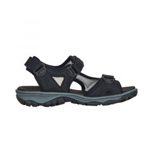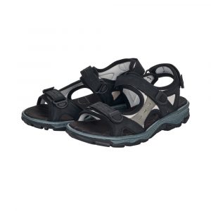 Rieker 68872-00 Sandal i Sort til Dame. Dejlig let og flexibel sandal i sort, med grå/sølv detaljer. Modellen har 3 justerbar velcro lukninger, som gør det let at tilpasse modellen til netop din fod. Modellen er dejlig blød og har en god pasform.