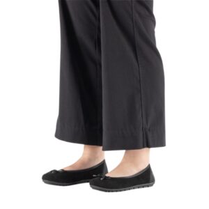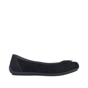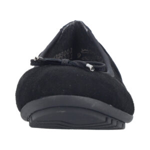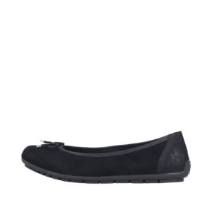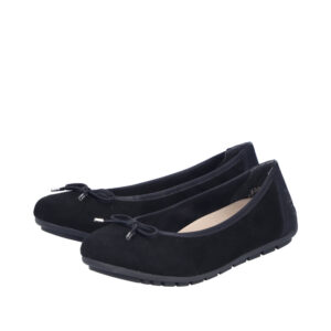 Rieker Ballerinasko til dame i sort. Elegant ballerinasko i sort skind med en fin sløjfedetalje på fronten. Skoen er et godt valg til både arbejde og særlige anledninger. Den bløde skindsål indvendigt giver en behagelig fornemmelse gennem dagen. Samtidig bidrager de stødabsorberende egenskaber til øget komfort, og ydersålens mønster øger stabilitet og et godt greb.