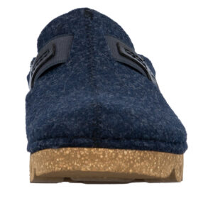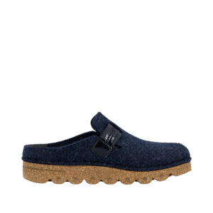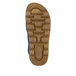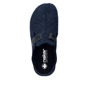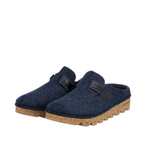 Rieker hjemmesko til dame i blå. Denne hjemmesko er ideel til hverdagen, hvor komfort og funktionalitet er i fokus. Den er lavet i filt materiale der holder fødderne lune, hjemmeskoen er udstyret med elastik, der tilpasser sig foden. Hjemmeskoen er uden hælkappe, som modellen hurtig at tage på og af, indvendigt giver den bløde sål en god komfort. Mens ydersålen i kork har et mønster der øger skridsikkerhed.