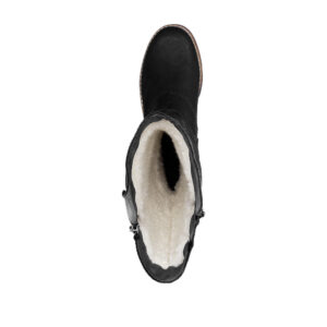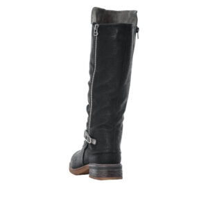 Rieker lang støvle til dame i sort. Elegant og moderne sort støvle med fine detaljer, der giver et tidløst look. Støvlen har en funktionel lynlås på indersiden, så den er nem at tage af og på, samt en delvist funktionel lynlås på ydersiden, der kan åbnes lidt for en mere fleksibel pasform. Indvendigt giver den varme foring og den bløde indersål god komfort og holder fødderne lune. Takket være Rieker-Tex er støvlen kraftigt vandafvisende, mens den robuste ydersål med mønster og stødabsorbering giver stabilitet og øget skridsikkerhed.