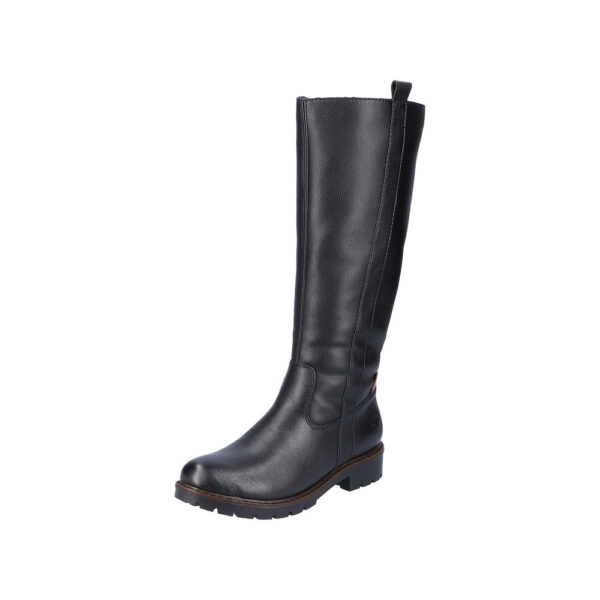 Rieker lang støvle til dame i sort. Stilren sort støvle med en moderne og klassisk kombination i designet. Overdelen er lavet af blødt skind, og den funktionelle lynlås på indersiden gør støvlen let at tage på. En lille elastik øverst på skaftet giver ekstra bevægelighed og en bedre pasform. Indvendigt har støvlen en blød, varm foring, der holder fødderne komfortable. Ydersålen er stødabsorberende og mønstret for øget skridsikkerhed.