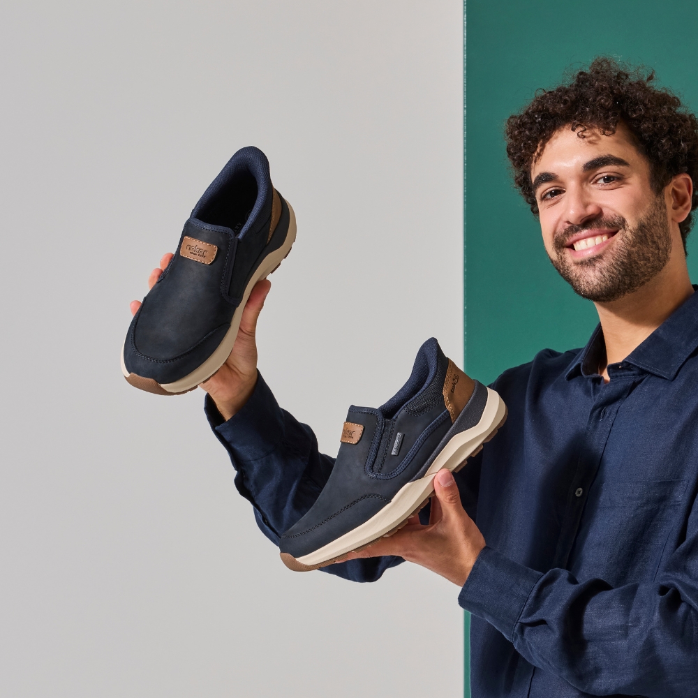 Rieker Ready 2 Go hyttesko til herre i blå. Smarte hyttesko med en flot skindoverdel og funktionelle detaljer, der gør skoen nem og praktisk i hverdagen. Ready 2 Go og den faste hælkappe gør, at du kan tage skoen på uden brug af hænder. Skoen er udstyret med Rieker-Tex, som gør den kraftigt vandafvisende. Indvendigt finder du en blød og udtagelig sål samt ekstra bredde (H), der giver god komfort og rummelighed. Ydersålen med mønster giver øget stødabsorbering og skridsikkerhed gennem dagen.