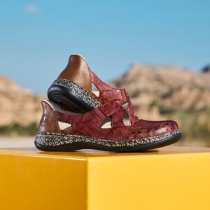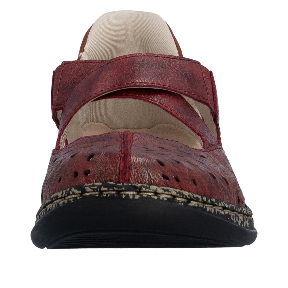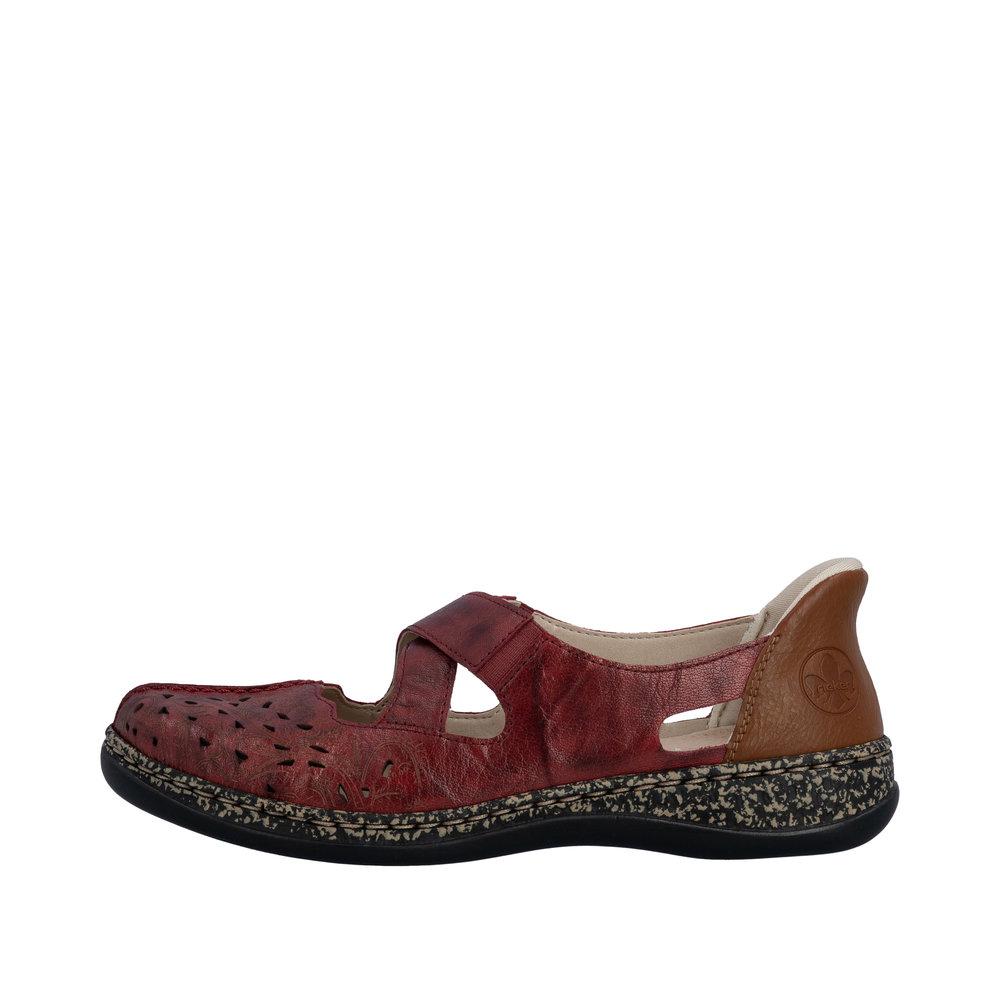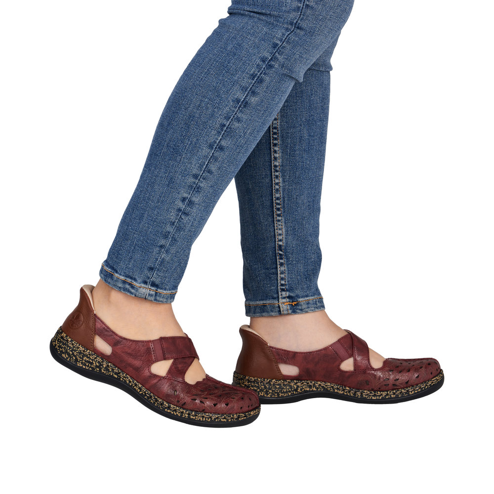 Rieker Ready 2 Go sko i rød til dame. Elastiske remme over vristen gør skoen åndbar og komfortabel hele dagen. De små detaljer tilfører et flot og personligt touch. Takket være Hands Free Ready 2 Go teknologi og den faste hælkappe kan du nemt træde i skoen uden at bruge hænder. Den lette og fleksible ydersål med Antistress giver stødabsorbering, som sikre optimal komfort og god støtte.