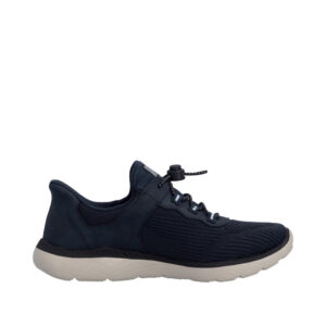 Rieker Ready 2 Go sneakers til dame i blå. En praktisk og komfortabel sko, der passer perfekt til en aktiv hverdag. Den justerbare elastik samt den faste hælkappe gør skoen nem at komme i og af uden brug af hænder. Indvendigt er skoen udstyret med en Rieker-soft sål, som giver god komfort dagen igennem. Ydersålens mønster giver øget støtte og skridsikkerhed.