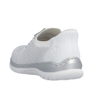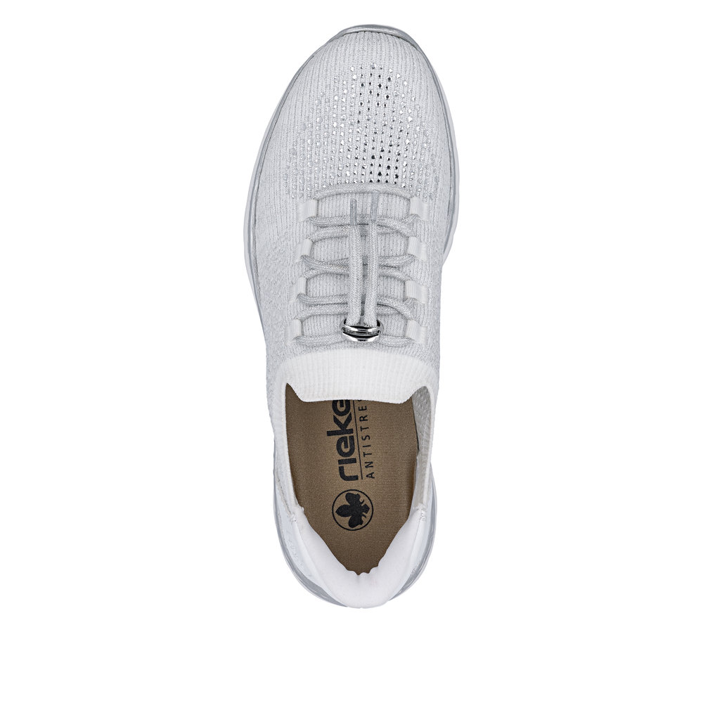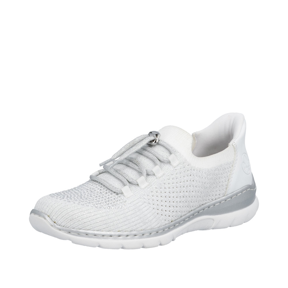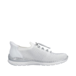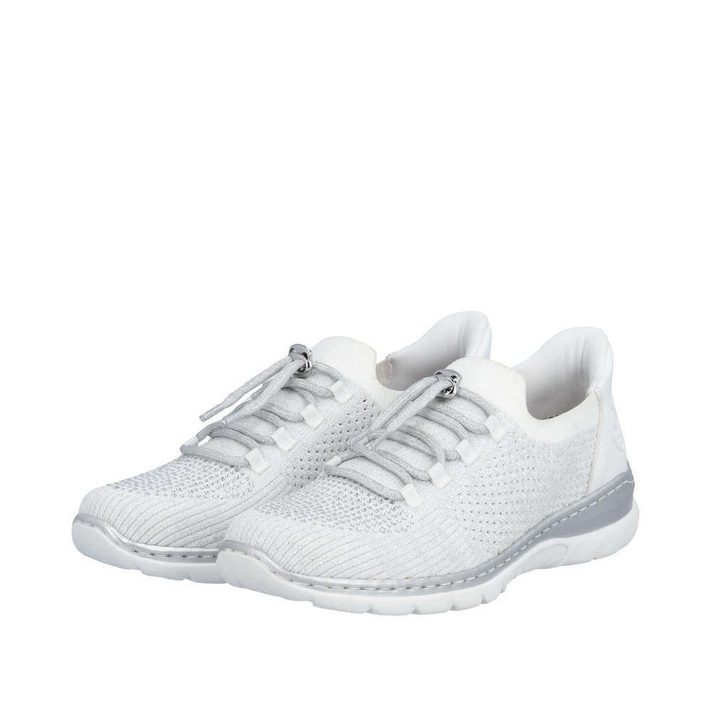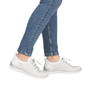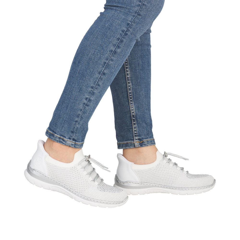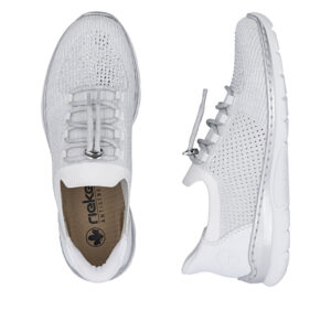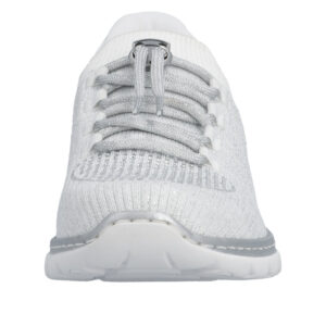 Rieker Ready 2 Go sneakers til dame i hvid. Elegante sko med sølv nitter foran og et udtryk, der passer godt til hverdagen. Skoen har justerbar elastik samt en fast hælkappe, som gør det let at tage skoen på og af uden hænder. Indvendigt finder du en blød Memosoft sål, der sikrer høj komfort hele dagen. Ydersålen er udstyret med et mønster, som giver øget støtte og skridsikkerhed.