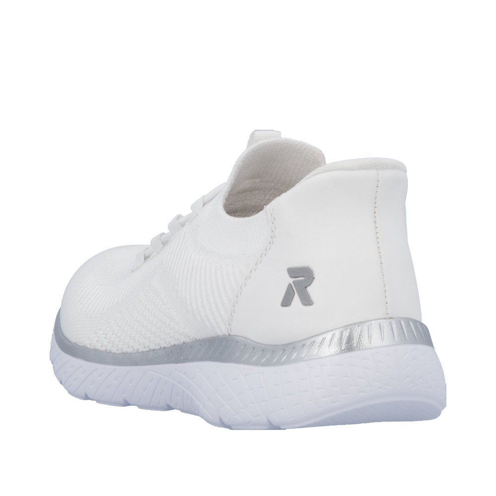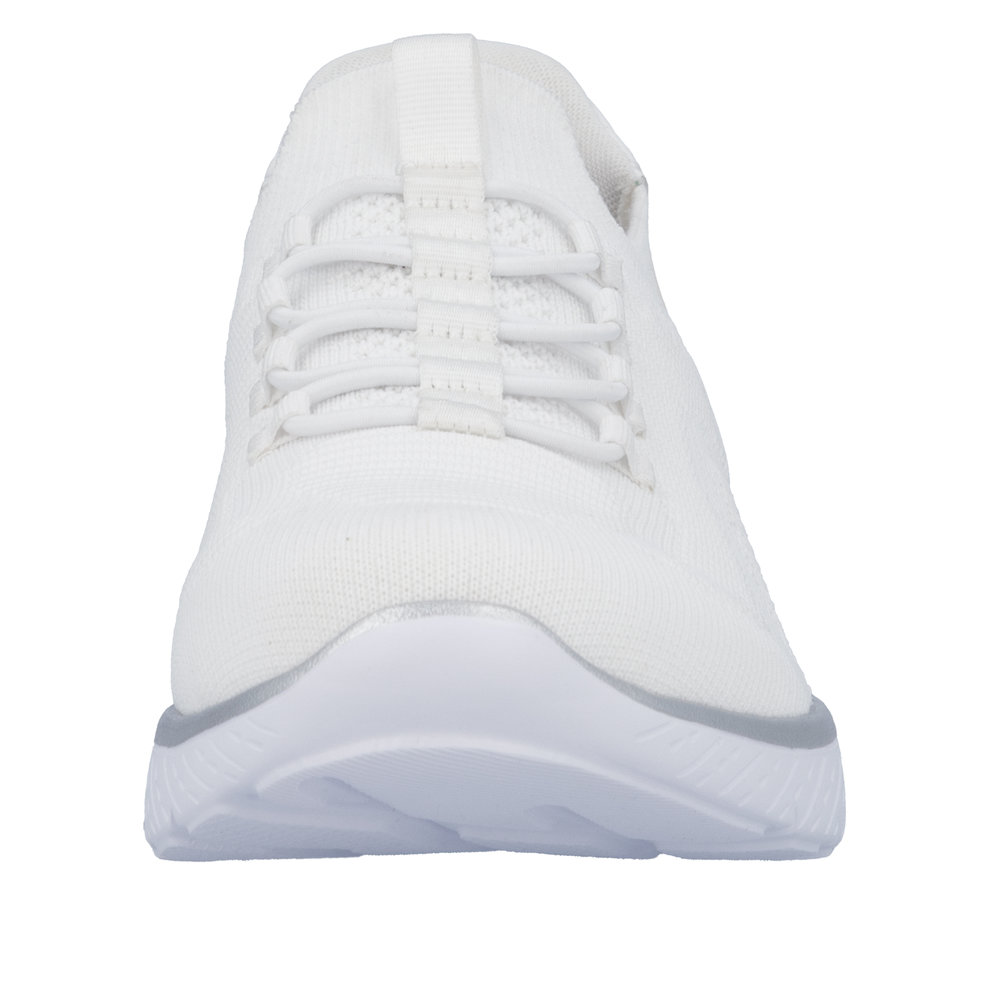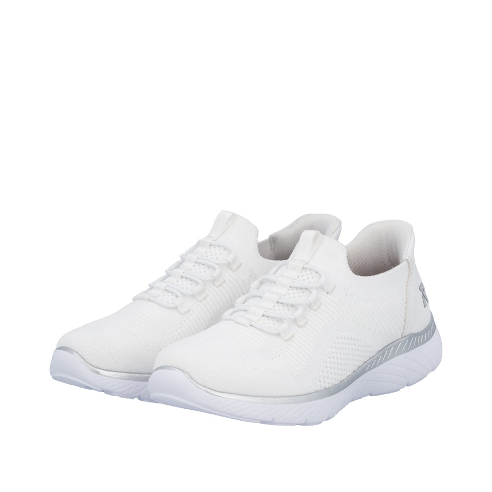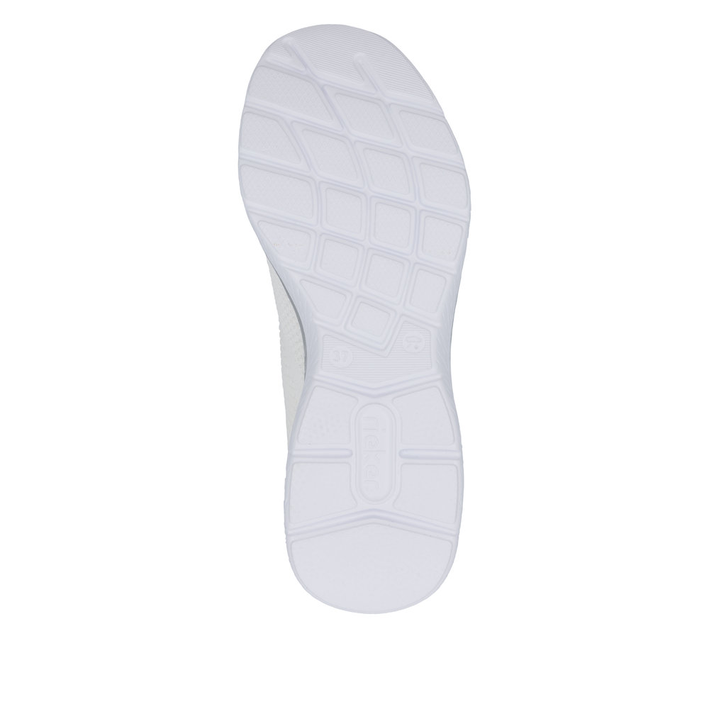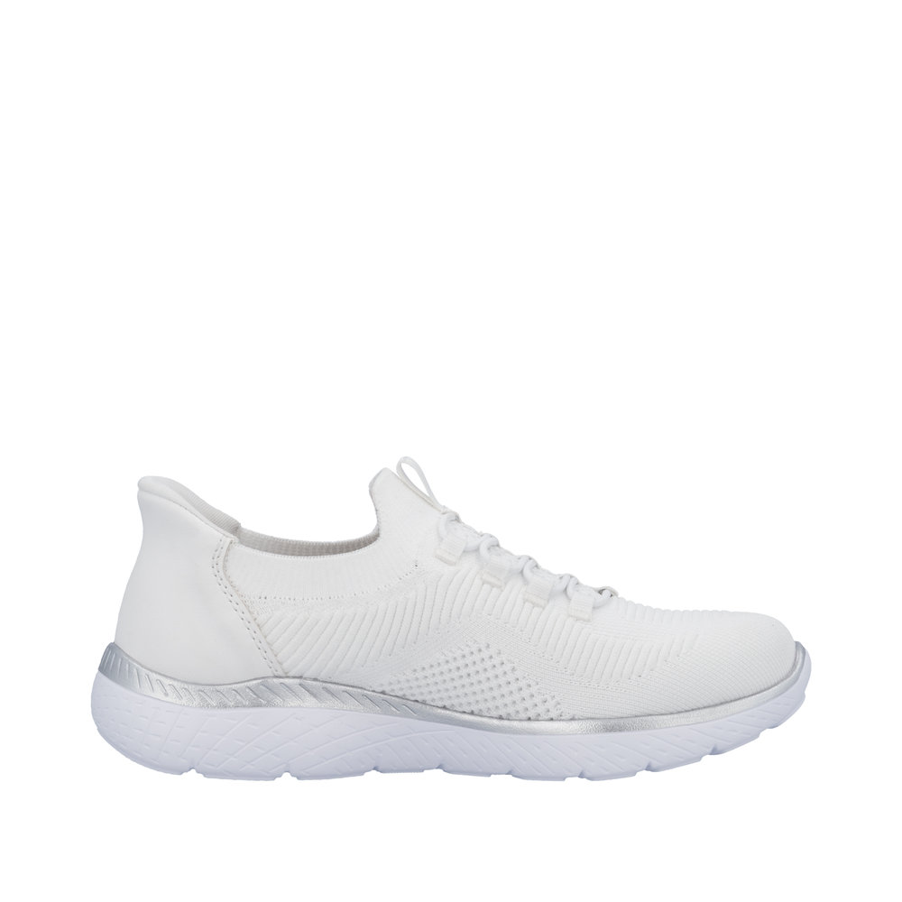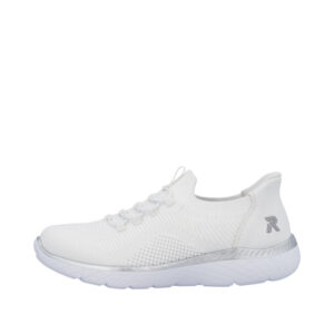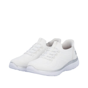 Rieker Ready 2 Go sneakers til dame i hvid. Flotte hvide sneakers med et moderne udtryk og elastik foran, som gør pasformen fleksibel og behagelig. Med Hands Free Ready 2 Go teknologi og den faste hælkappe er det let at tage skoen på uden hænder. Indvendigt mødes du af en blød Memosoft sål, der giver skøn komfort dagen igennem. Ydersålen er stødabsorberende og designet med mønster for bedre stabilitet og øget skridsikkerhed.
