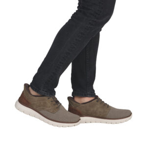 Rieker Ready 2 Go sneakers til herre i beige. Disse moderne beige sneakers kombinerer funktionalitet og stil. Med Rieker Ready 2 Go-teknologi og fast hælkappe kan du let træde i skoen uden at bruge hænder. Den elastiske front sikrer en god pasform, mens den lette konstruktion gør skoen behagelig at have på. Indvendigt giver den bløde indersål høj komfort, og den mønstrede ydersål med stødabsorbering giver stabilitet og øget skridsikkerhed hele dagen.