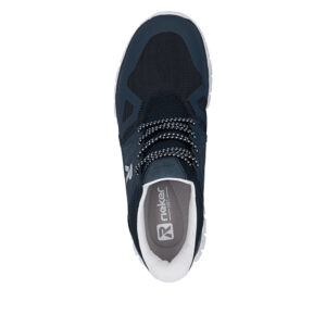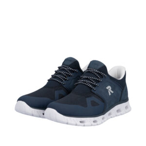 Rieker Ready 2 Go sneakers til herre i blå. Denne sneakers er udstyret med Hands Free Ready 2 Go teknologi, som gør det muligt at tage skoen på uden brug af hænder takket være den faste hælkappe. Elastikken foran giver en fleksibel og behagelig pasform. Indvendigt finder du en udtagelig Rieker-Soft indersål, som sikrer god komfort hele dagen. Ydersålen har et mønster, der bidrager til god stødabsorbering ved daglig brug.