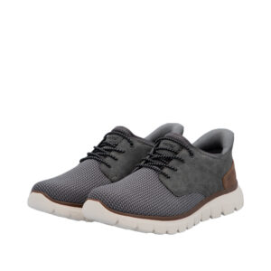 Rieker Ready 2 Go sneakers til herre i grå. Stilfulde grå sneakers med et moderne udtryk og praktiske detaljer. Med Rieker Ready 2 Go-teknologi og fast hælkappe kan du nemt træde i skoen uden brug af hænder. Den lette, fleksible sål og elastikken foran sikrer en behagelig pasform, mens den bløde indersål giver god støtte. Ydersålen med mønster og stødabsorbering sørger for stabilitet og øget skridsikkerhed gennem hele dagen.