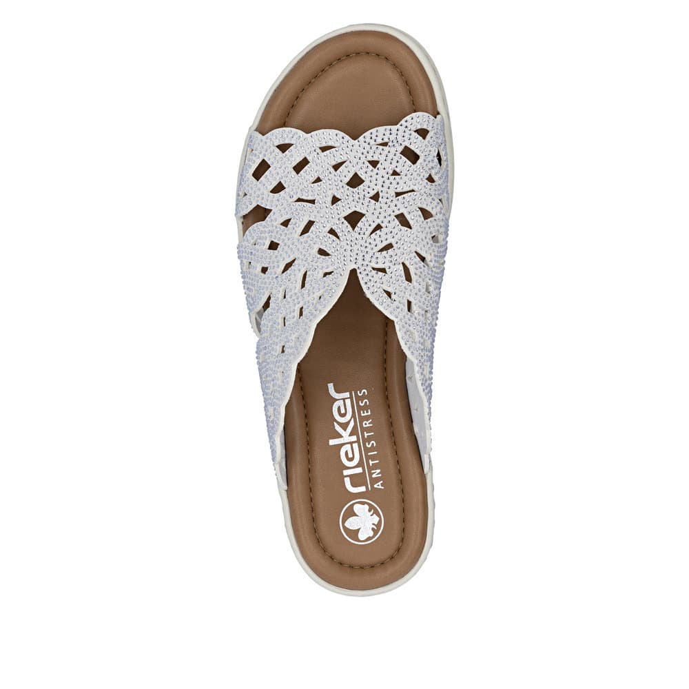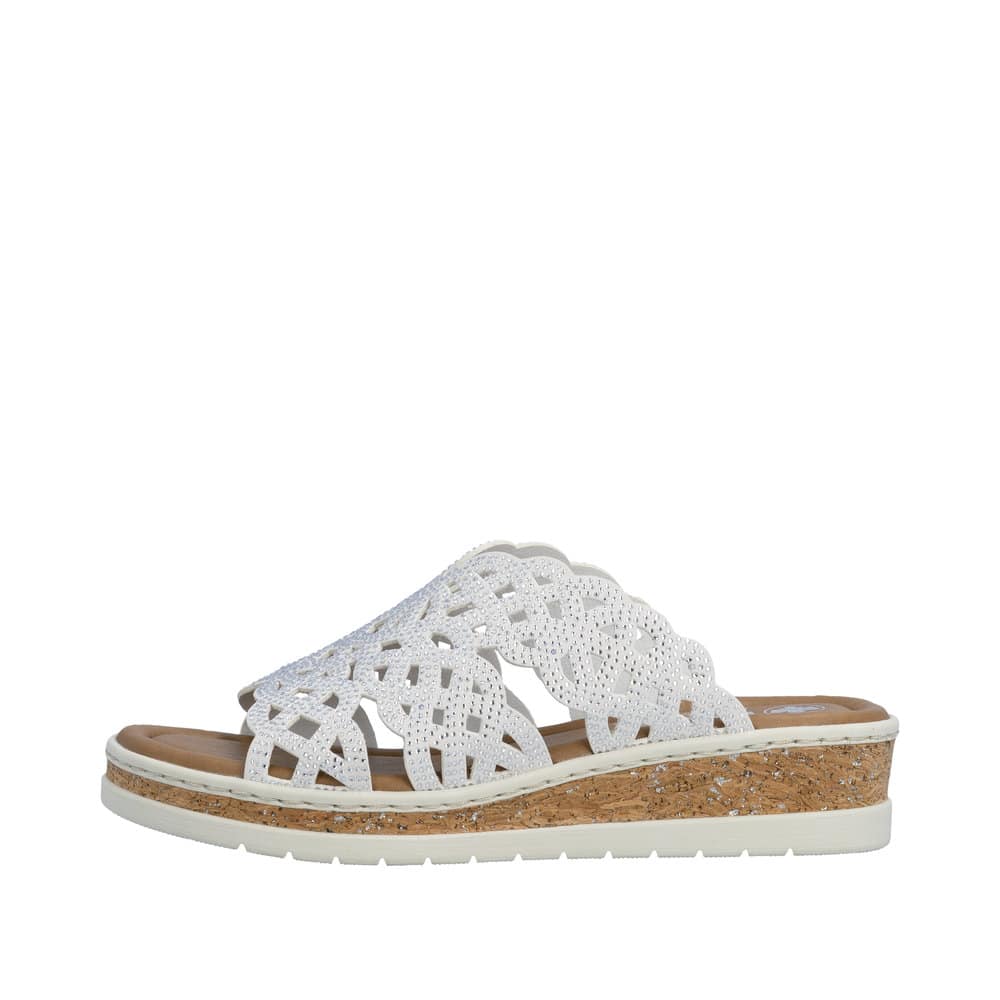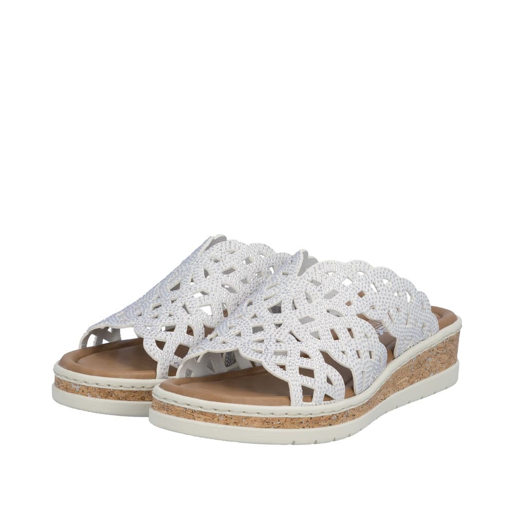 Rieker sandaler til dame i beige. Disse elegante sandaler har en glitrende overdel og er designet uden hælkappe, hvilket gør dem lette at tage på. Den bløde indersål sikrer komfort hele dagen, og den 4 cm høje kilehæl giver et pænt løft uden at gå på kompromis med komfort. Ydersålen med mønster øger stødabsorbering og skridsikkerhed.