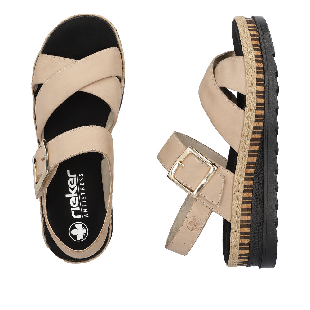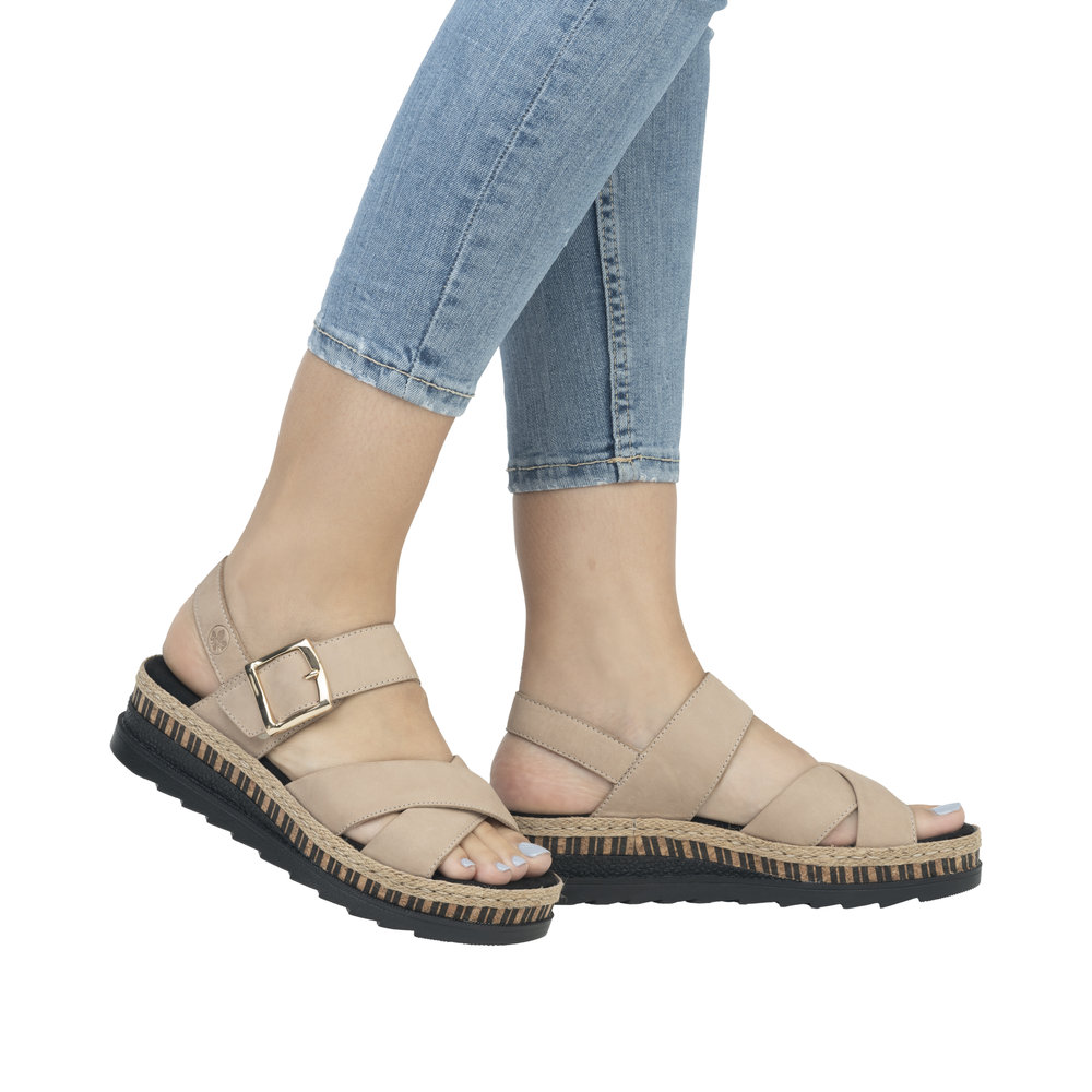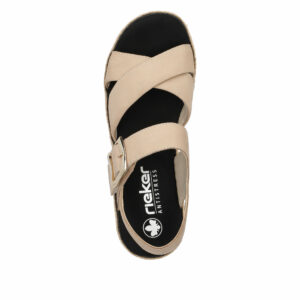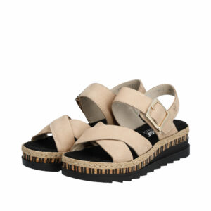Rieker sandal til dame i beige. Flot og stilfuld sandal, der smukt kombinerer en beige farve med en sort sål. Sandalen har en elegant skindoverdel, der fremhæves af en krydsrem og en forgyldt spænde. Desuden har modellen en behagelig blød sål med stødabsorberende egenskaber, hvilket sikrer en optimal komfortoplevelse. Den skridsikre sål giver ekstra tryghed under fødderne.