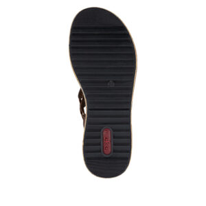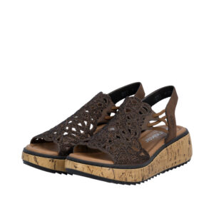 Rieker sandal til dame i brun. Stilfuld sandal med glimmerdetaljer, der giver et feminint og moderne look. Elastikken i siderne gør den nem at få på og sikrer en fleksibel pasform. Den bløde skindsål indvendigt giver en behagelig fornemmelse dagen igennem. Kilehælen på 5 cm giver et pænt løft, samtidig med at komforten bevares. Ydersålen giver øget stødabsorbering og skridsikkerhed.
