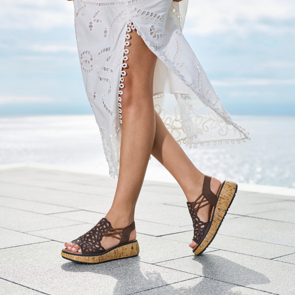 Rieker sandal til dame i brun. Stilfuld sandal med glimmerdetaljer, der giver et feminint og moderne look. Elastikken i siderne gør den nem at få på og sikrer en fleksibel pasform. Den bløde skindsål indvendigt giver en behagelig fornemmelse dagen igennem. Kilehælen på 5 cm giver et pænt løft, samtidig med at komforten bevares. Ydersålen giver øget stødabsorbering og skridsikkerhed.