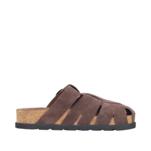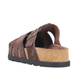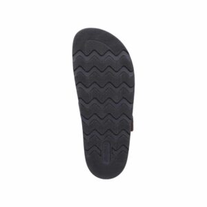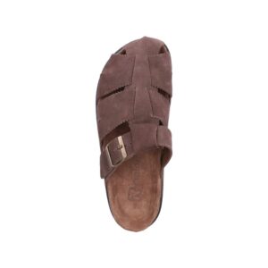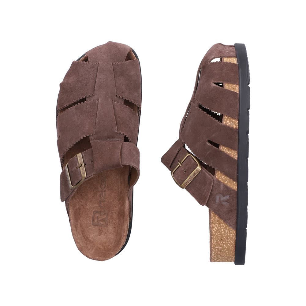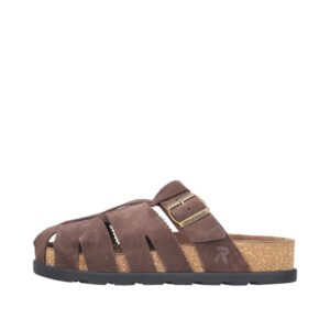Rieker slippers til dame i brun. Disse moderne slippers er lavet af mørkebrunt skind og har et elegant look. Med en lukket fod og en justerbar rem med spænde får du en sko, der tilpasses perfekt til din fod. Den er designet med Rieker Antistress, hvilket gør den både let og fleksibel.