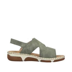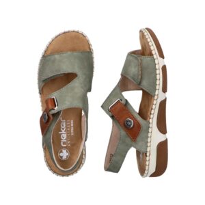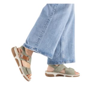 Rieker sandal til dame i grøn. Denne sandal har et stilrent look med praktiske velcroremme, der gør dem lette at tage af og på. Den bløde indersål med ekstra bredde H sikrer god plads og komfort. Med Rieker Antistress og stødabsorbering kan du nyde lange dage uden træthed i fødderne.