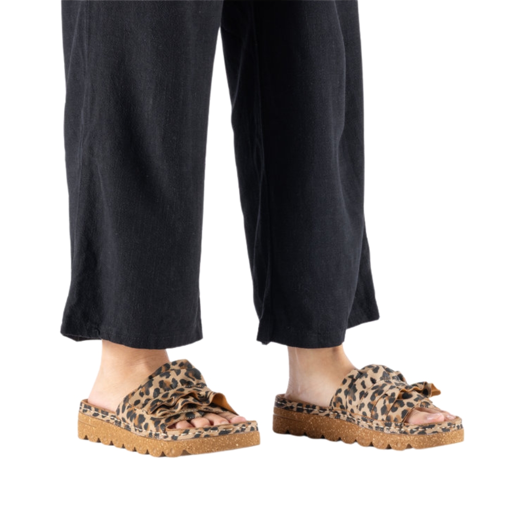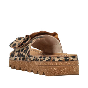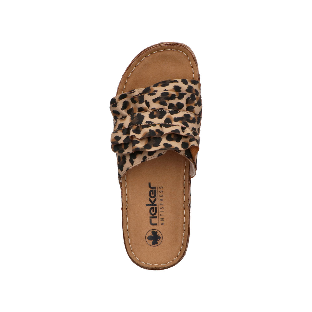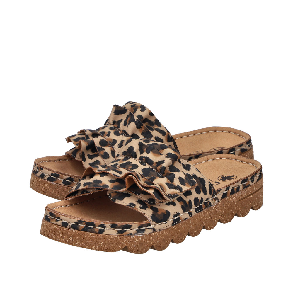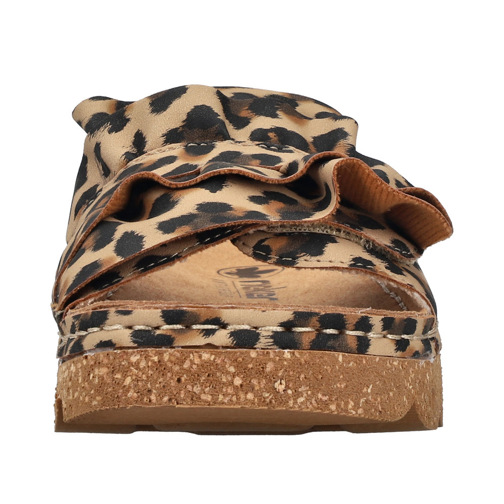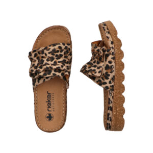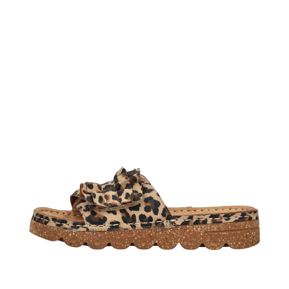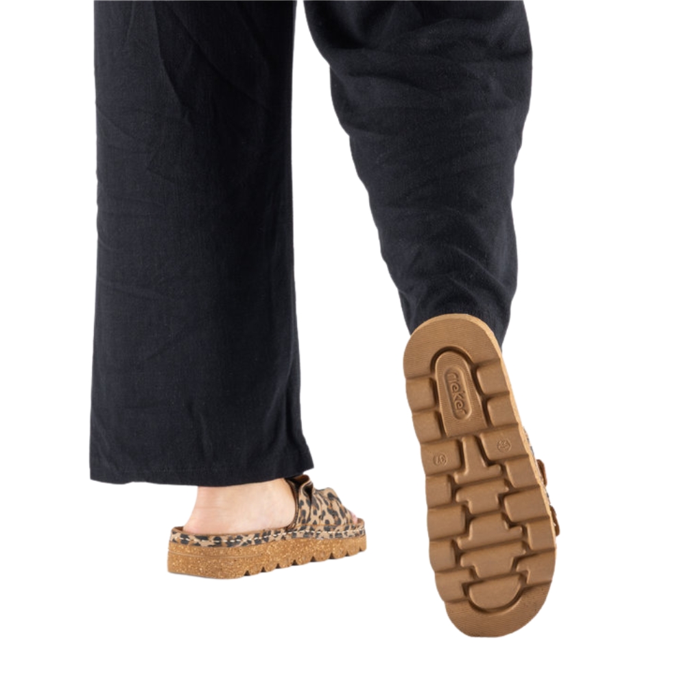 Rieker sandal til dame i leopard. Flot sandal i imiteret ruskind med leoparddesign med dekorative, bølgede detaljer på remmen, som giver et feminint look. Velcroremmen over forfoden gør det let at tilpasse sandalen, så den sidder godt på foden. Indvendigt sørger den bløde indersål for komfort dagen igennem. Plateausålen på 3,8 cm giver et pænt løft, og den stødabsorberende Rieker Antistress ydersål bidrager til god støtte og stabilitet.