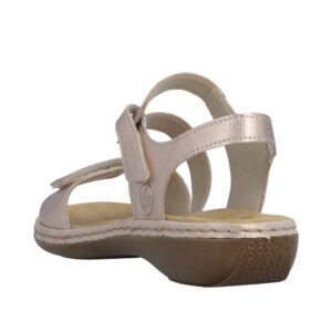 Rieker sandal til dame i metallic. Lys-pink metallic sandal fra Rieker i blødt skind, der giver en fleksibel og behagelig pasform. Med to velcroremme kan du hurtigt justere sandalen efter behov, mens de stødabsorberende såler bidrager til en komfortabel gang, og den tekstilbeklædte indersål føles blød mod foden. En sandal med et enkelt look og god komfort til sommerens dage.