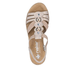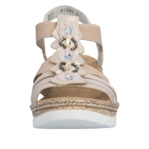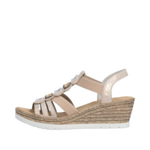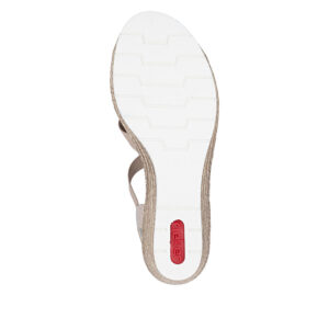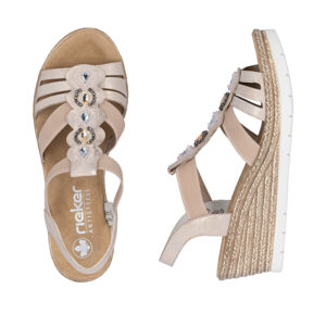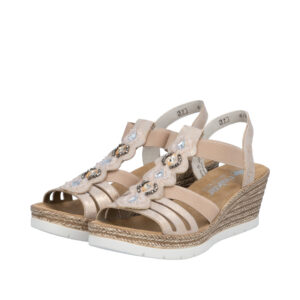 Rieker sandal til dame i rosa. Elegant og moderne sandal i en smuk rosa farve, perfekt til enhver lejlighed. De stilfulde remme over forfoden giver et sofistikeret udtryk, mens de to elastik remme gør sandalen behagelig og nem at tage på. Smukke detaljer foran fuldender det feminine design, og den 6 cm kilehæl sørger for et flot løft. Sandalen er desuden udstyret med en stødabsorberende ydersål, der sikrer langvarig komfort og støtte.
