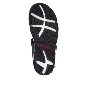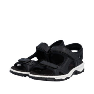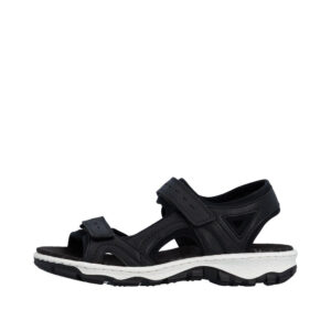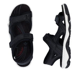 Rieker sandal til dame i sort. Rieker sandalen er designet med fokus på komfort og bevægelsesfrihed. Den lette, stødabsorberende sål giver god stabilitet, når du er på farten. Med de justerbare velcroremme kan pasformen nemt tilpasses efter behov, så sandalen sidder behageligt hele dagen. Perfekt til vandring og lange gåture.