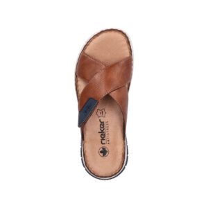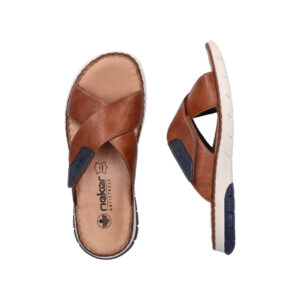 Rieker sandal til herre i brun. Let og fleksibel sandal i brun, der kombinerer et pænt udtryk med god komfort. Sandalen har velcrorem over vristen, så pasformen nemt kan justeres, og den åbne hæl gør det hurtigt at komme i og af den. Indvendigt er sandalen udstyret med en blød skindsål, som sammen med ekstra bredde G sikrer komfort hele dagen. Den solide ydersål er fleksibel og stødabsorberende og bidrager til en behagelig oplevelse.