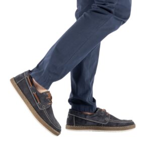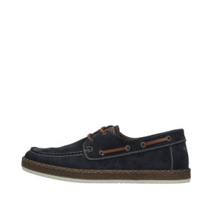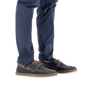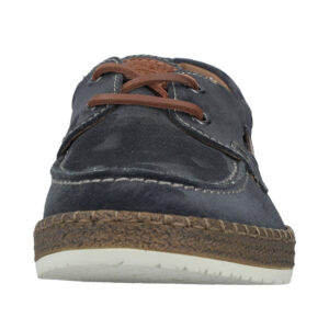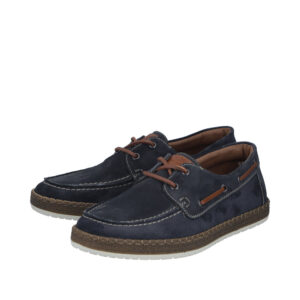 Rieker sejlersko til herre i mørkeblå. Klassisk sejlersko i mørkeblå ruskind med snøredetaljer, der understreger det moderne design. Snørebåndene giver en justerbar pasform og gør det let at tilpasse skoen til foden. Indvendigt mødes du af en blød skindsål med ekstra bredde G, som giver god plads og komfort dagen igennem. Ydersålen er let og fleksibel samt har stødabsorbering, som bidrager til en behagelig gang.