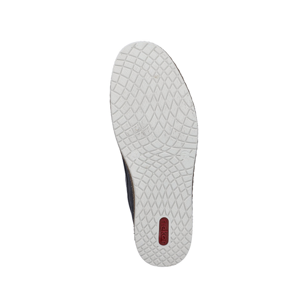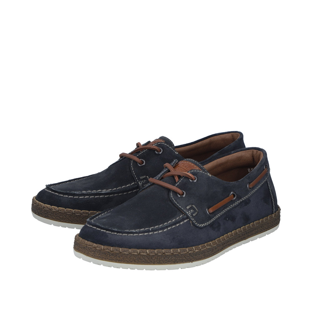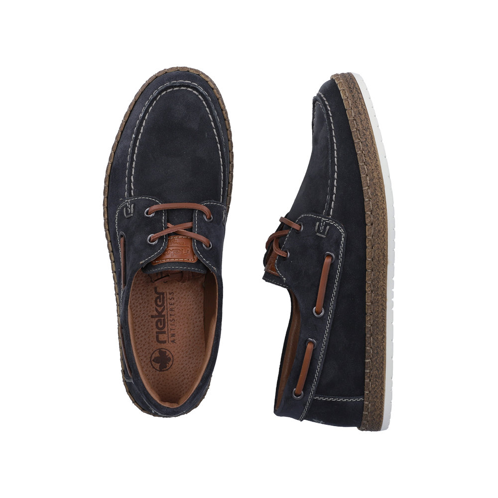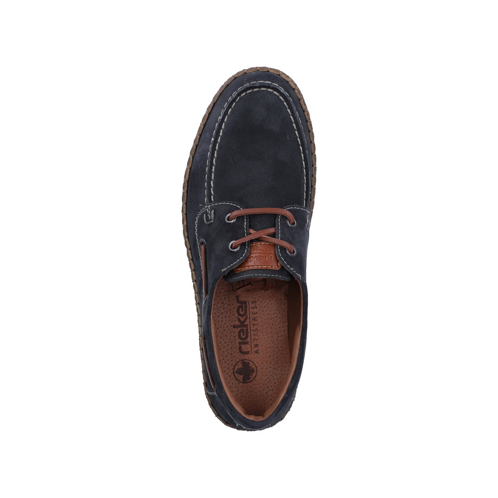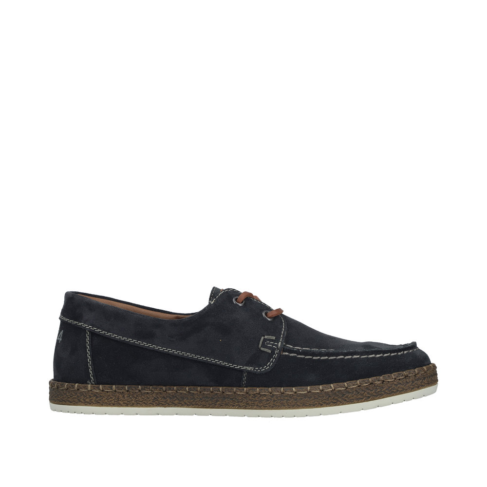 Rieker sejlersko til herre i mørkeblå. Klassisk sejlersko i mørkeblå ruskind med snøredetaljer, der understreger det moderne design. Snørebåndene giver en justerbar pasform og gør det let at tilpasse skoen til foden. Indvendigt mødes du af en blød skindsål med ekstra bredde G, som giver god plads og komfort dagen igennem. Ydersålen er let og fleksibel samt har stødabsorbering, som bidrager til en behagelig gang.
