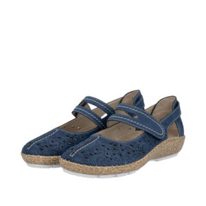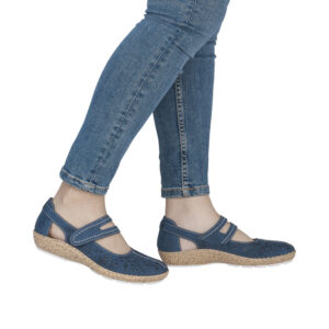 Rieker sko til dame i blå. Disse sko er designet med fokus på både stil og komfort i daglig brug. Velcrolukningen over vristen gør skoen let at komme i og af og giver en god pasform. Indvendigt er skoen udstyret med en blød skindsål, som sikrer god komfort dagen igennem. Ydersålen er designet med mønster, der giver øget stødabsorbering og skridsikkerhed.