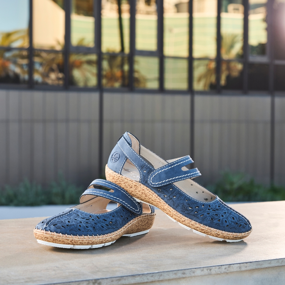 Rieker sko til dame i blå. Disse sko er designet med fokus på både stil og komfort i daglig brug. Velcrolukningen over vristen gør skoen let at komme i og af og giver en god pasform. Indvendigt er skoen udstyret med en blød skindsål, som sikrer god komfort dagen igennem. Ydersålen er designet med mønster, der giver øget stødabsorbering og skridsikkerhed.