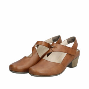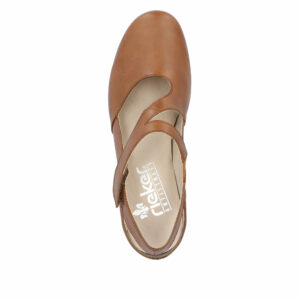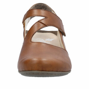 Rieker sko til dame i brun. Gør entré i disse lukkede damesko i ægte skind med en let 4 cm blokhæl. Denne dejlige åbne sko har en lædersål, der forbedrer holdbarheden, samt elastik på den ene side og velcro på den anden side, hvilket gør det nemt at tage skoen af og på. For øget komfort får du stødabsorberende såler samt mere rummelighed i denne sko.