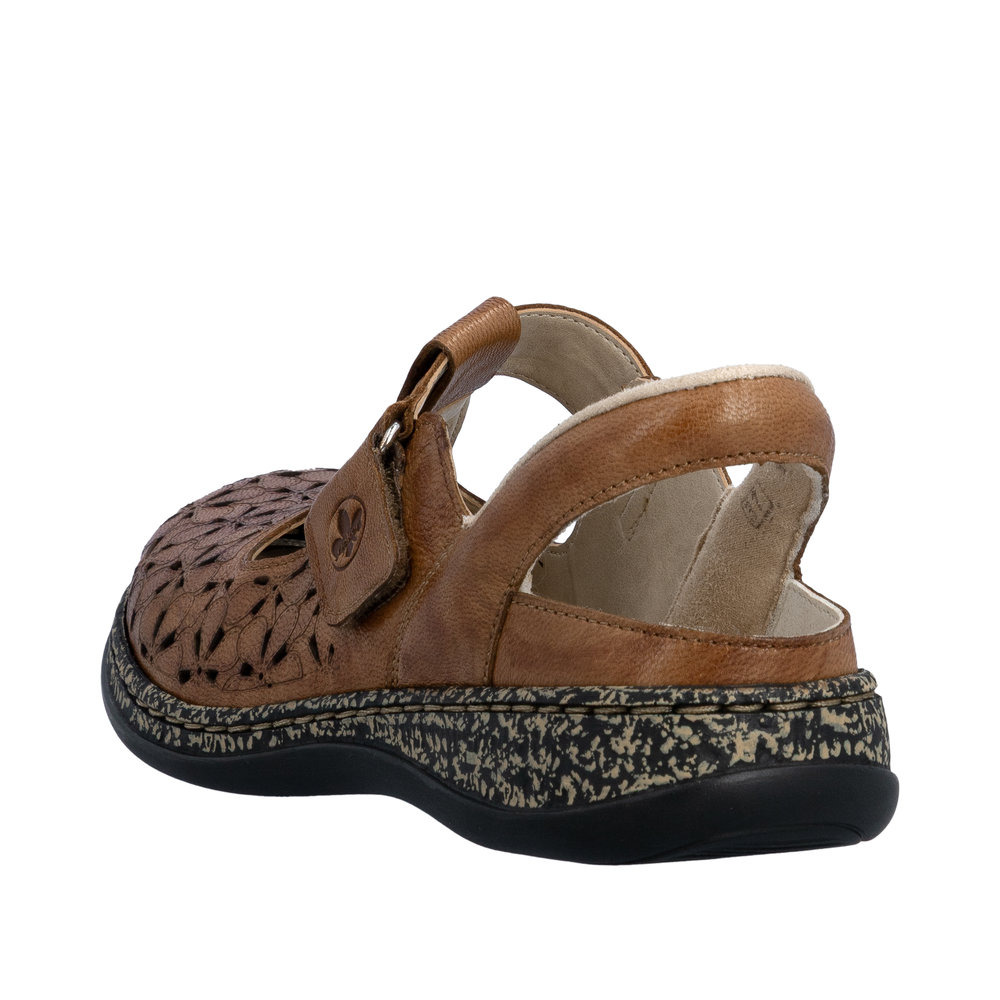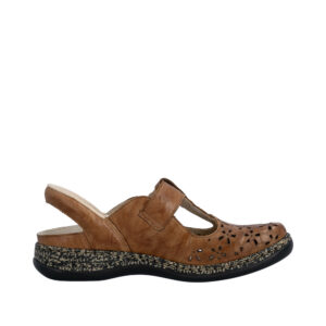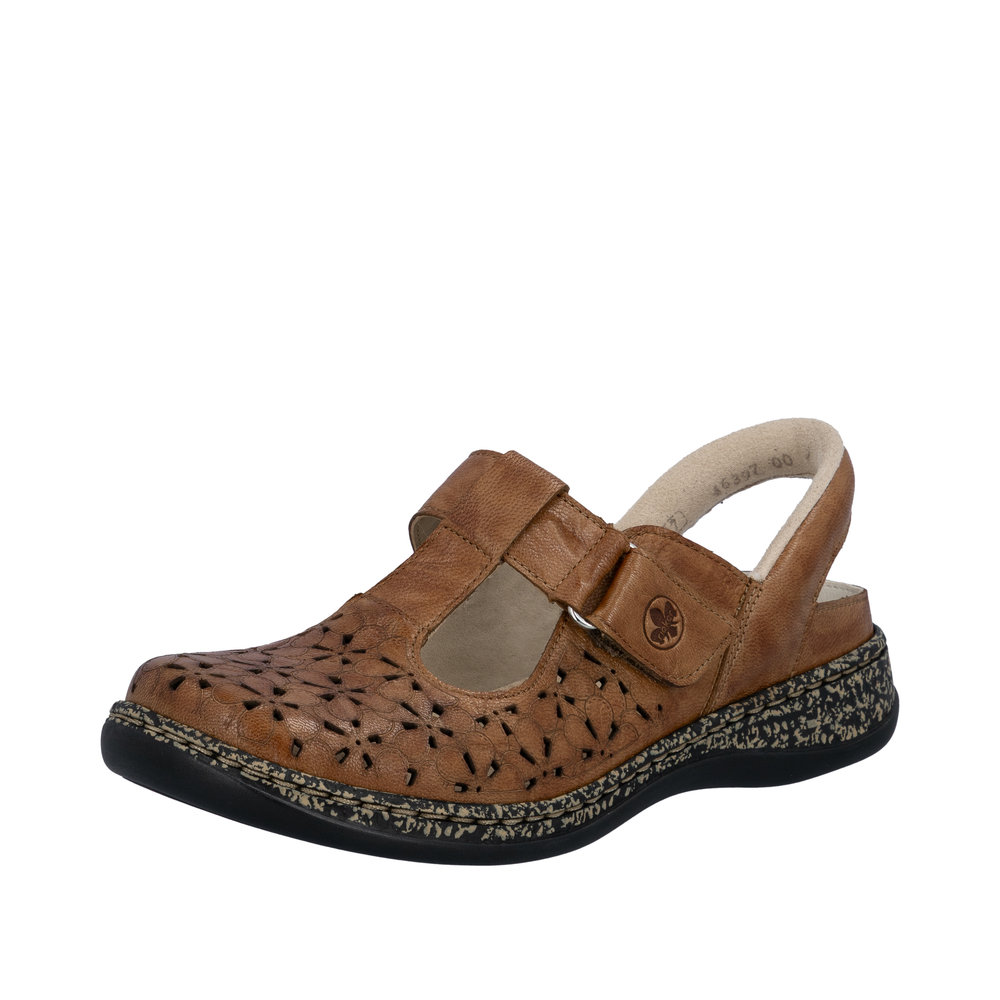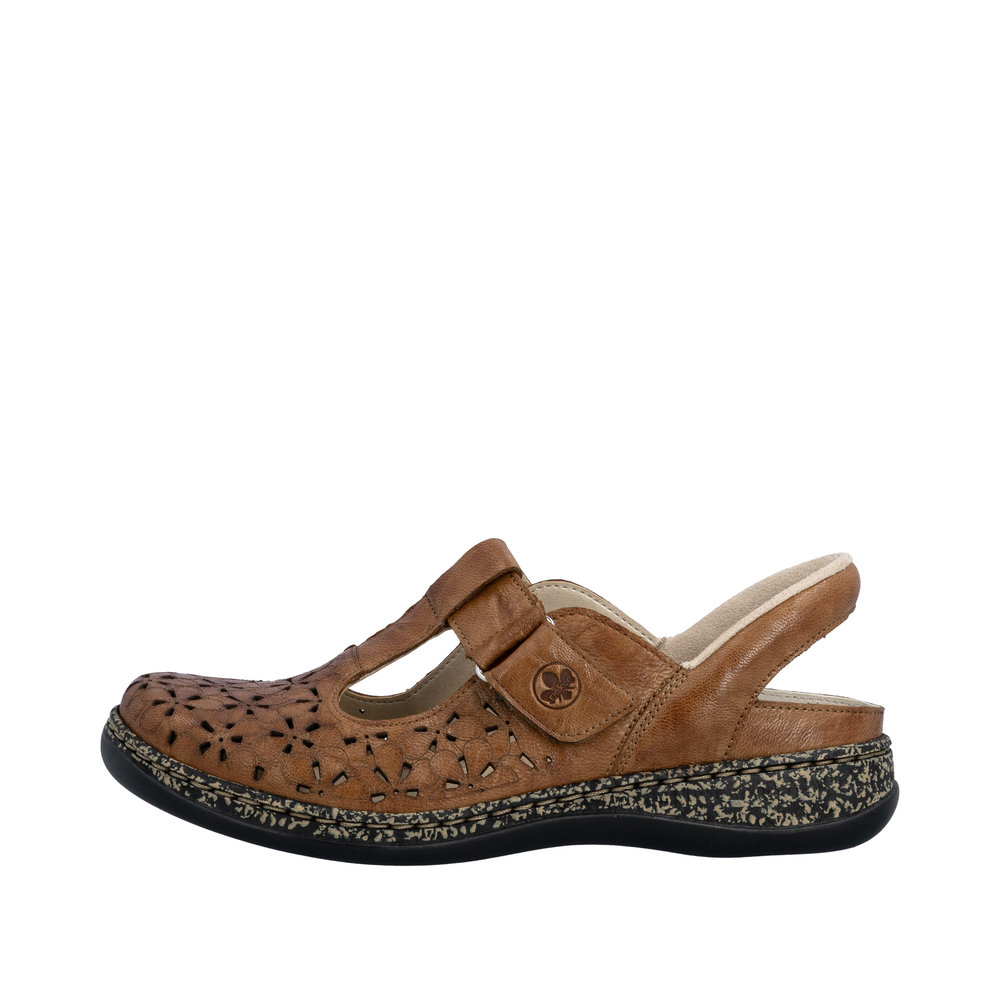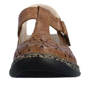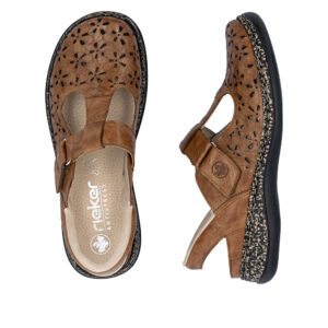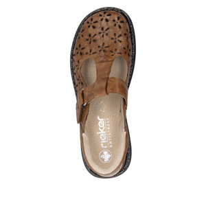 Rieker sko til dame i brun. Moderne sko i brun skind med flotte detaljer. Skoen har en blød hælrem, som gør den let at få på og behagelig at have på. Den justerbare velcrorem over vristen sikrer en god og fleksibel pasform. Med Rieker Antistress teknologien får du stødabsorbering og god komfort hele dagen.