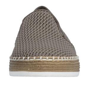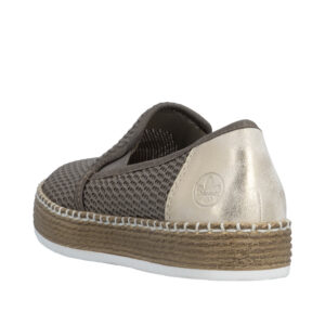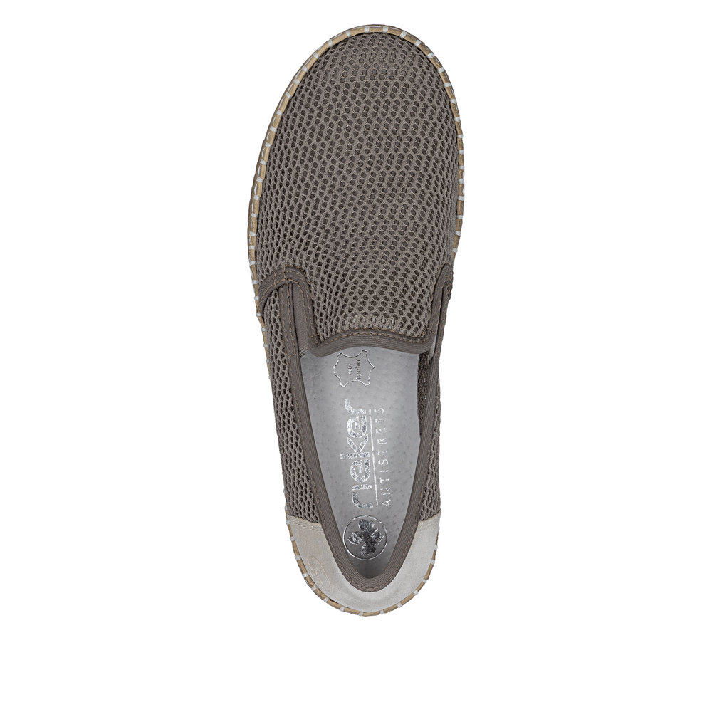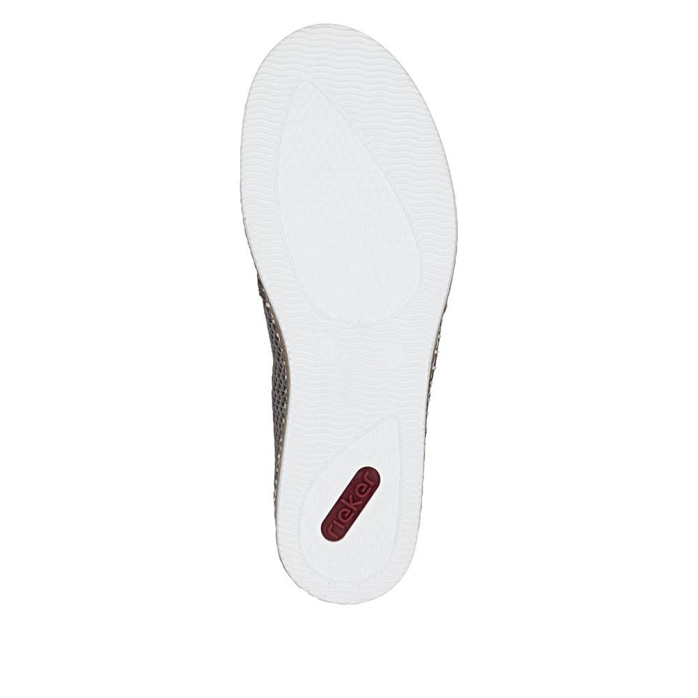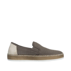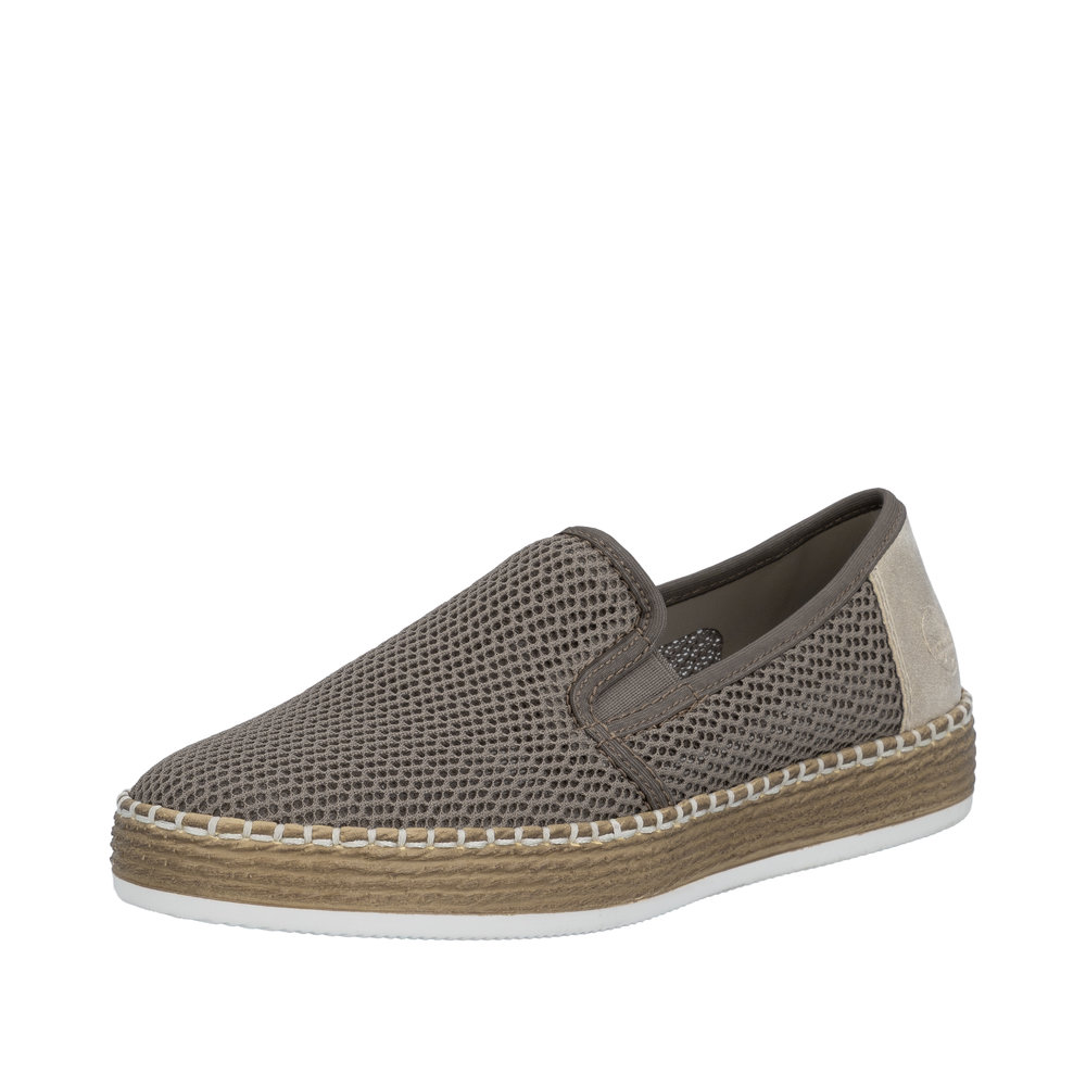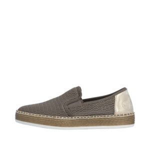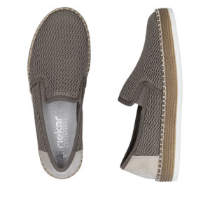 Rieker sko til dame i brun. Flot sko i brune og grå toner med fokus på både komfort og funktion. De praktiske elastikker i siderne gør det hurtigt at træde i skoen, mens etmaterialet på overdelen gør skoen luftig og velegnet til varmere dage. Indvendigt giver den fleksible skindsål en naturlig og behagelig fornemmelse og den stødabsorberende bund bidrager til en komfortabel gang hele dagen.