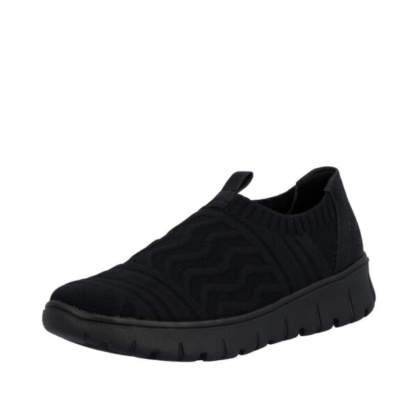 Rieker sko til dame i sort. Flot sort sko med et enkelt design og små detaljer over forfoden. Det elastiske materiale gør skoen fleksibel og let at tage på, samtidig med at pasformen sidder behageligt. Indvendigt er skoen udstyret med en blød og udtagelig sål med ekstra bredde H, som giver god plads og komfort. Ydersålen er solid og stødabsorberende, hvilket giver støtte ved daglig brug.