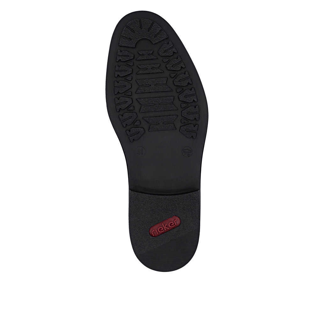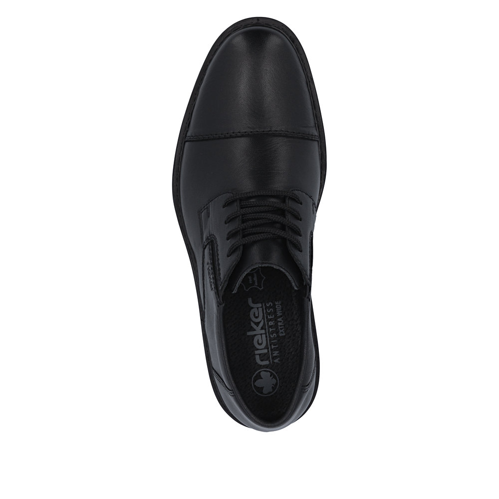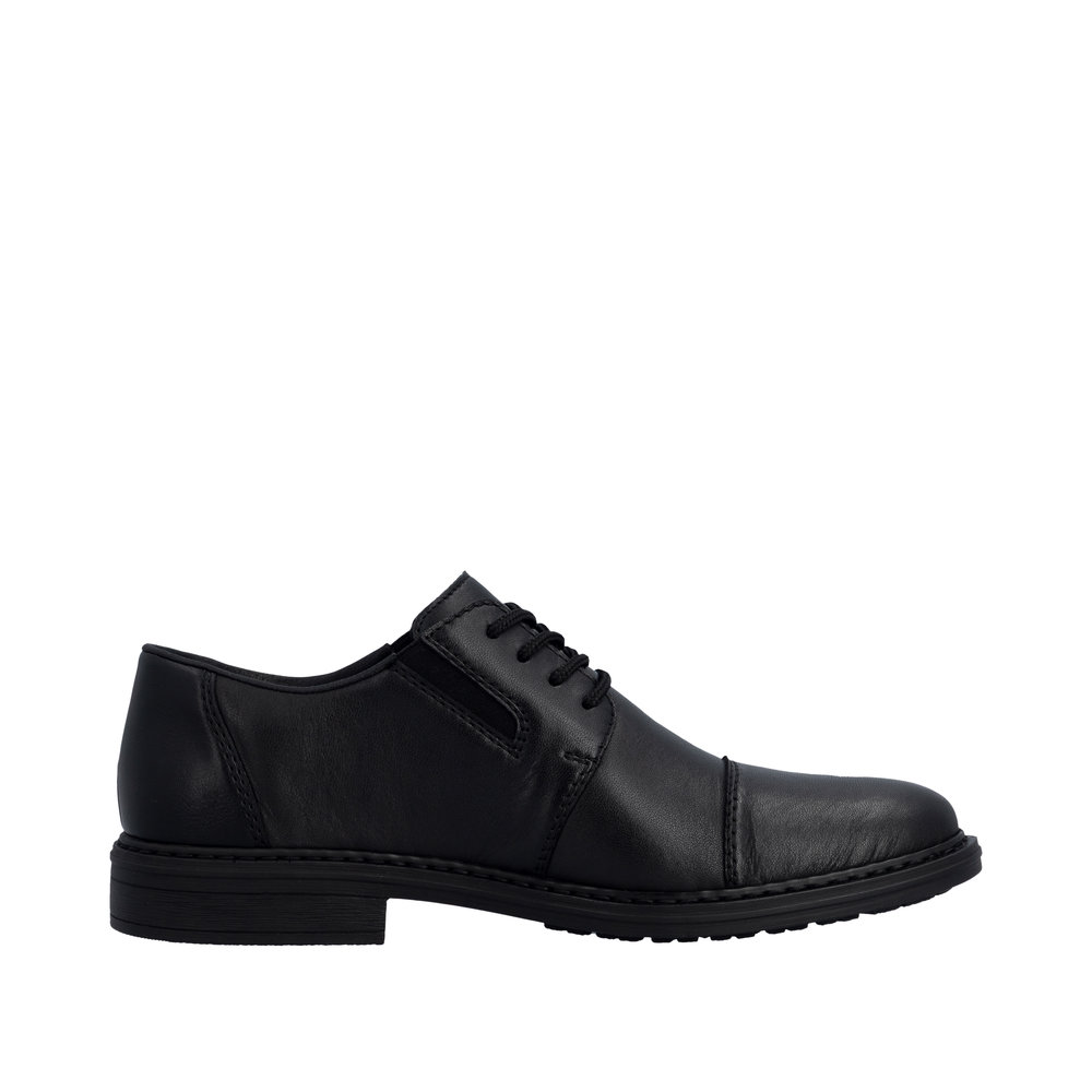 Rieker sko til herre i sort. Denne klassiske skindsko til herre er et godt valg, hvis du ønsker en kombination af funktion og komfort i hverdagen. Skoen har snørebånd og elastik, der gør den nem at komme i og af og giver en behagelig pasform. Indvendigt mødes du af en blød sål og ekstra bredde (H), som sikrer rummelighed og komfort hele dagen. Ydersålen med mønster giver øget stødabsorbering og skridsikkerhed, så hvert skridt føles mere behageligt.
