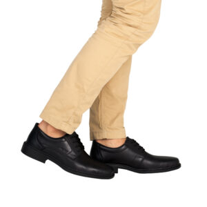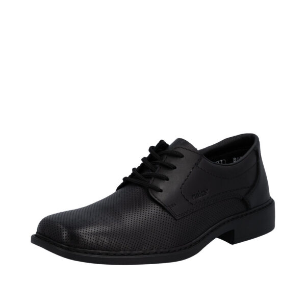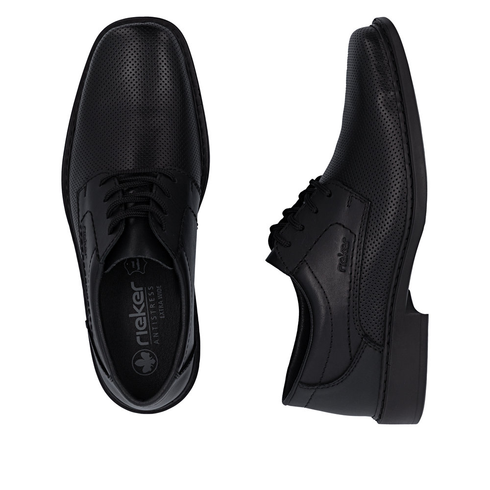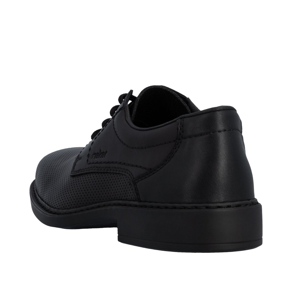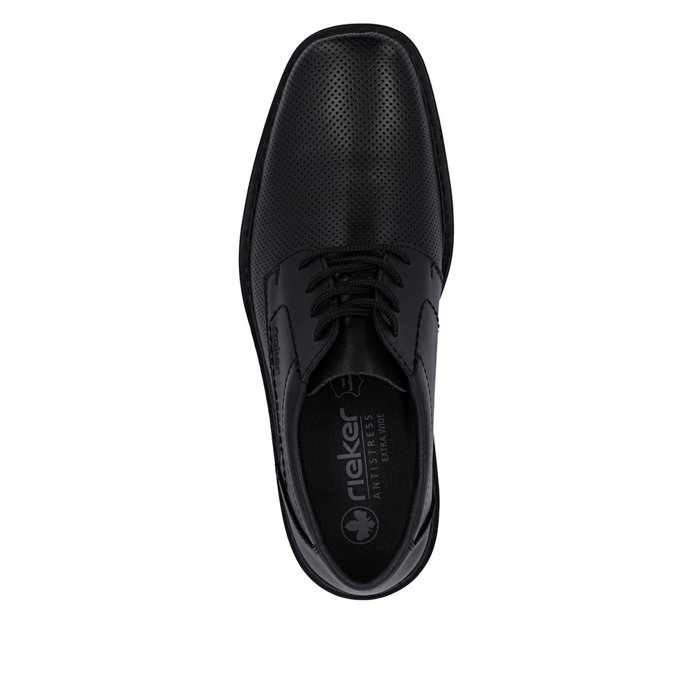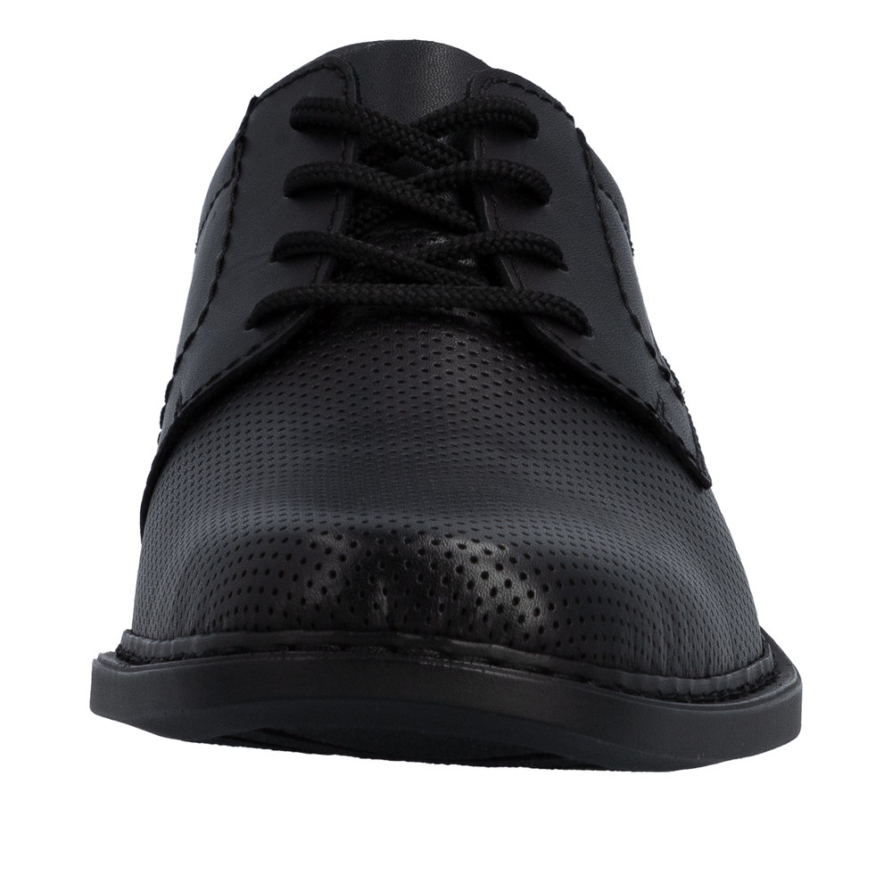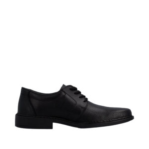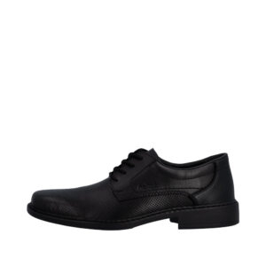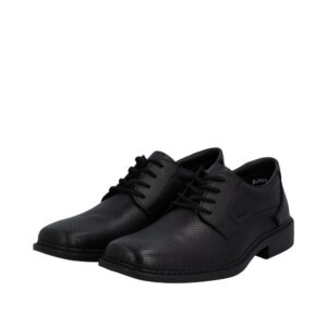 Rieker sko til herre i sort. Flot sko med skindoverdel og et roligt, klassisk udtryk. Skoen er udstyret med snørebånd, som gør det let at tilpasse pasformen efter behov. Indvendigt finder du en blød skindsål, der giver behagelig komfort hele dagen. Ekstra bredde (H) giver god rummelighed til foden. Mens ydersålen med mønster, giver øget stødabsorbering og skridsikkerhed ved daglig brug.