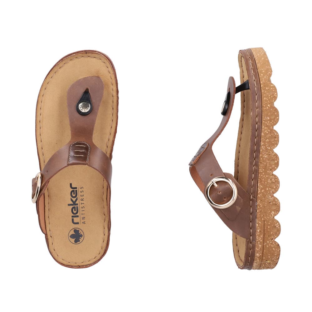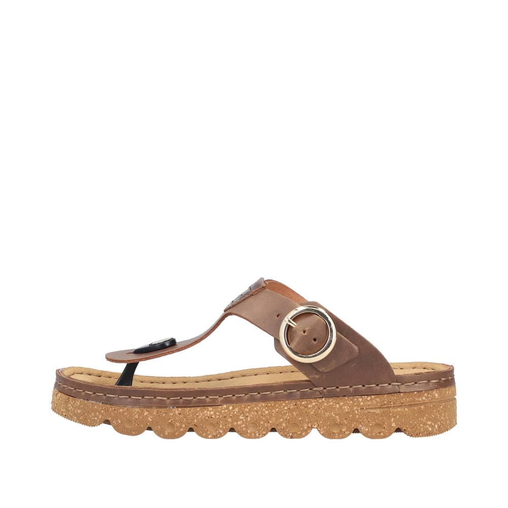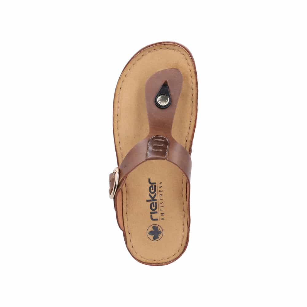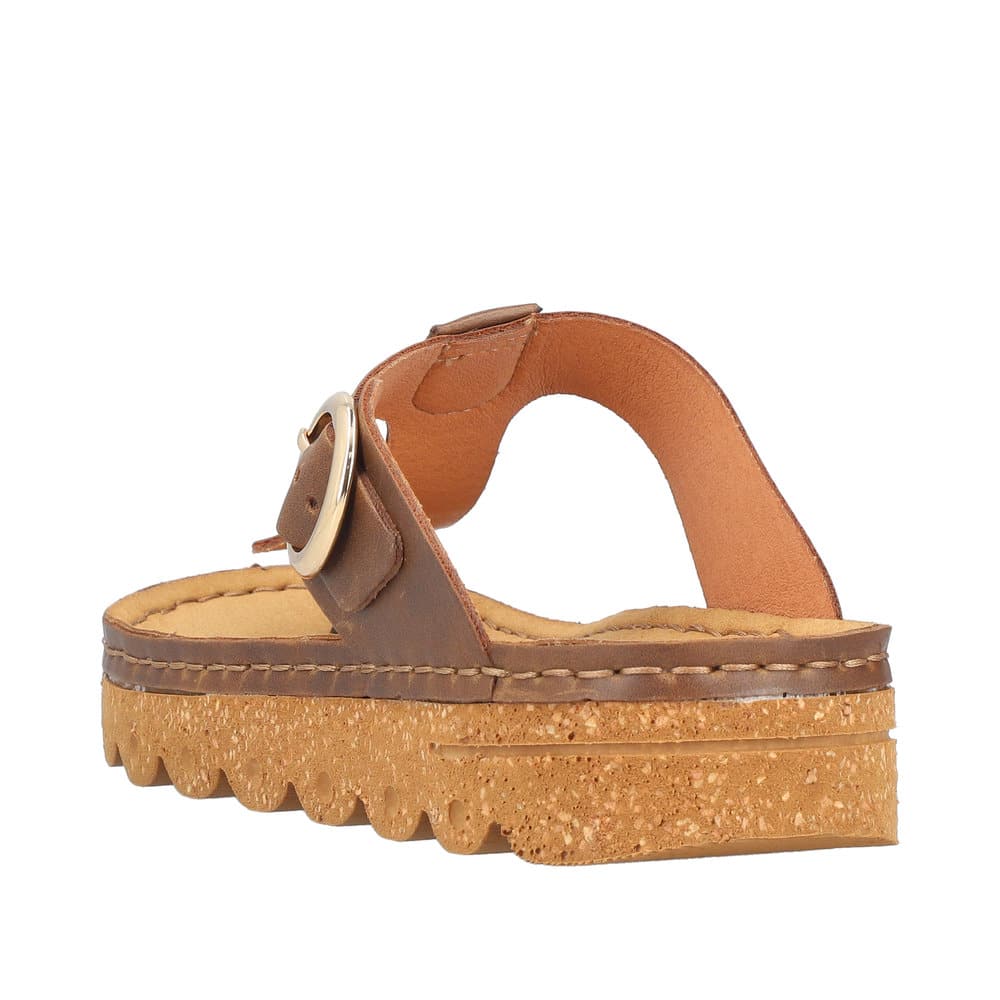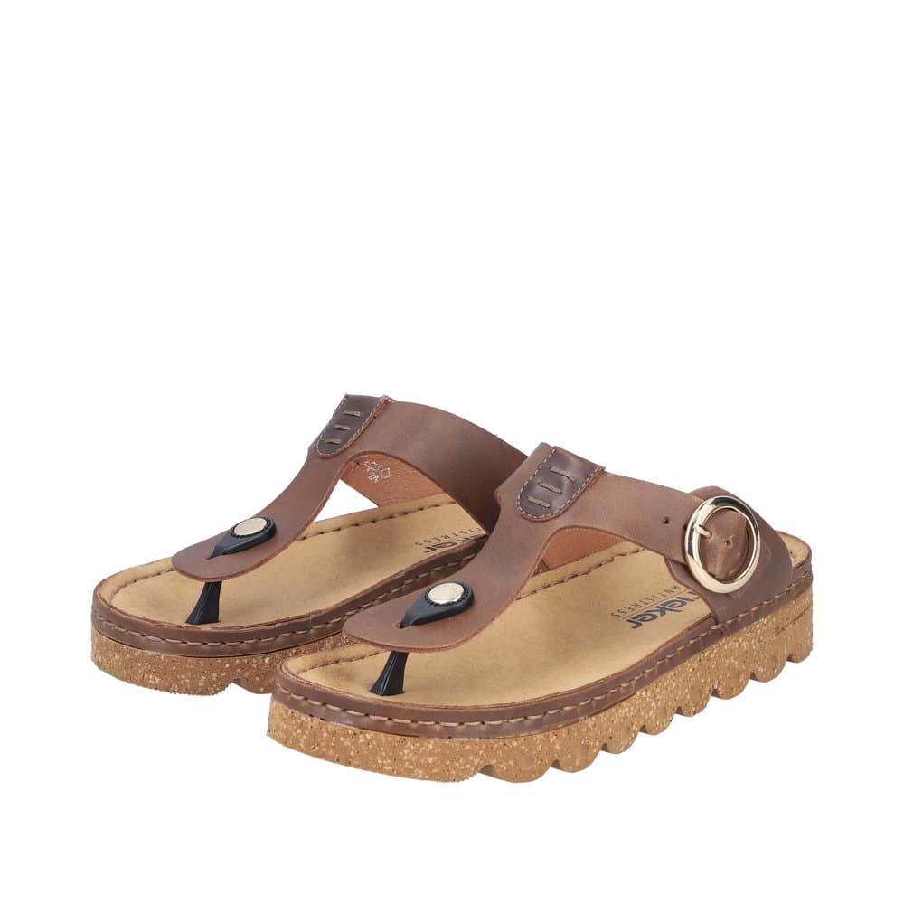Rieker slippers til dame i brun. Disse moderne slippers har en justerbar rem over vristen, der sikrer en god pasform. Indersålen er blød, hvilket giver optimal komfort hele dagen. Ydersålen er med Rieker Antistress og stødabsorbering for ekstra støtte.