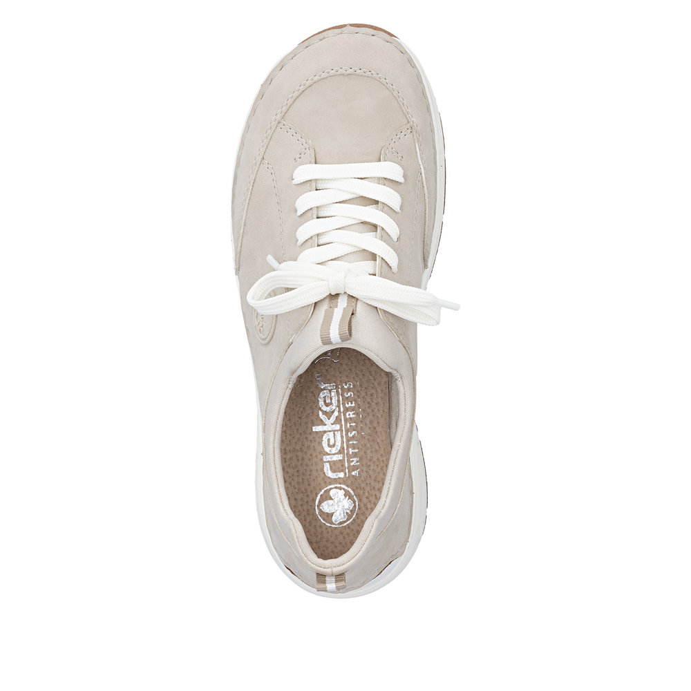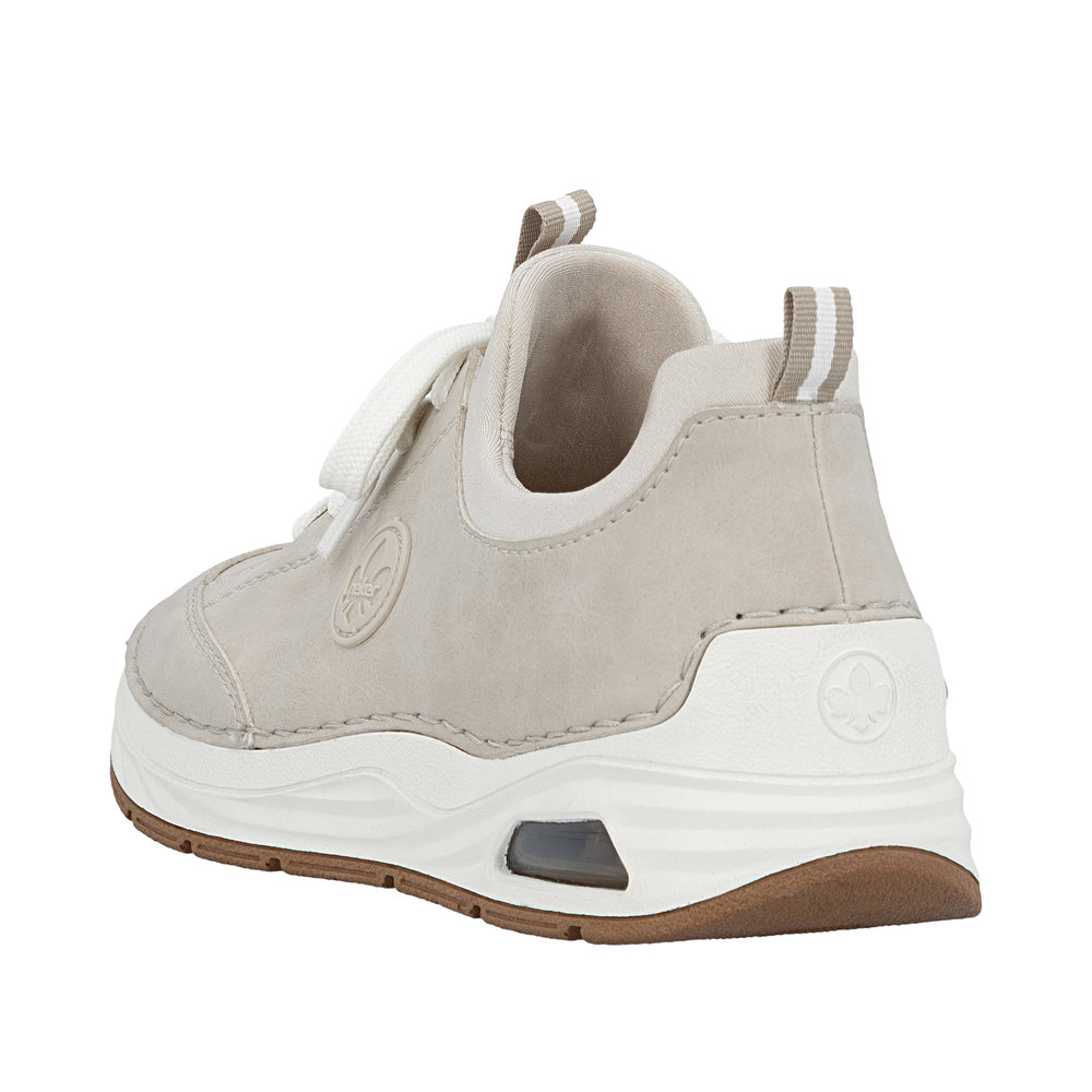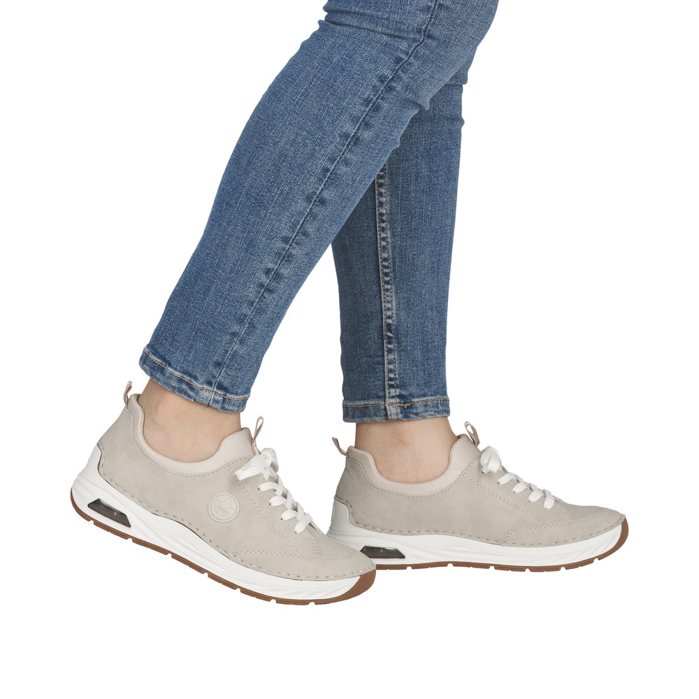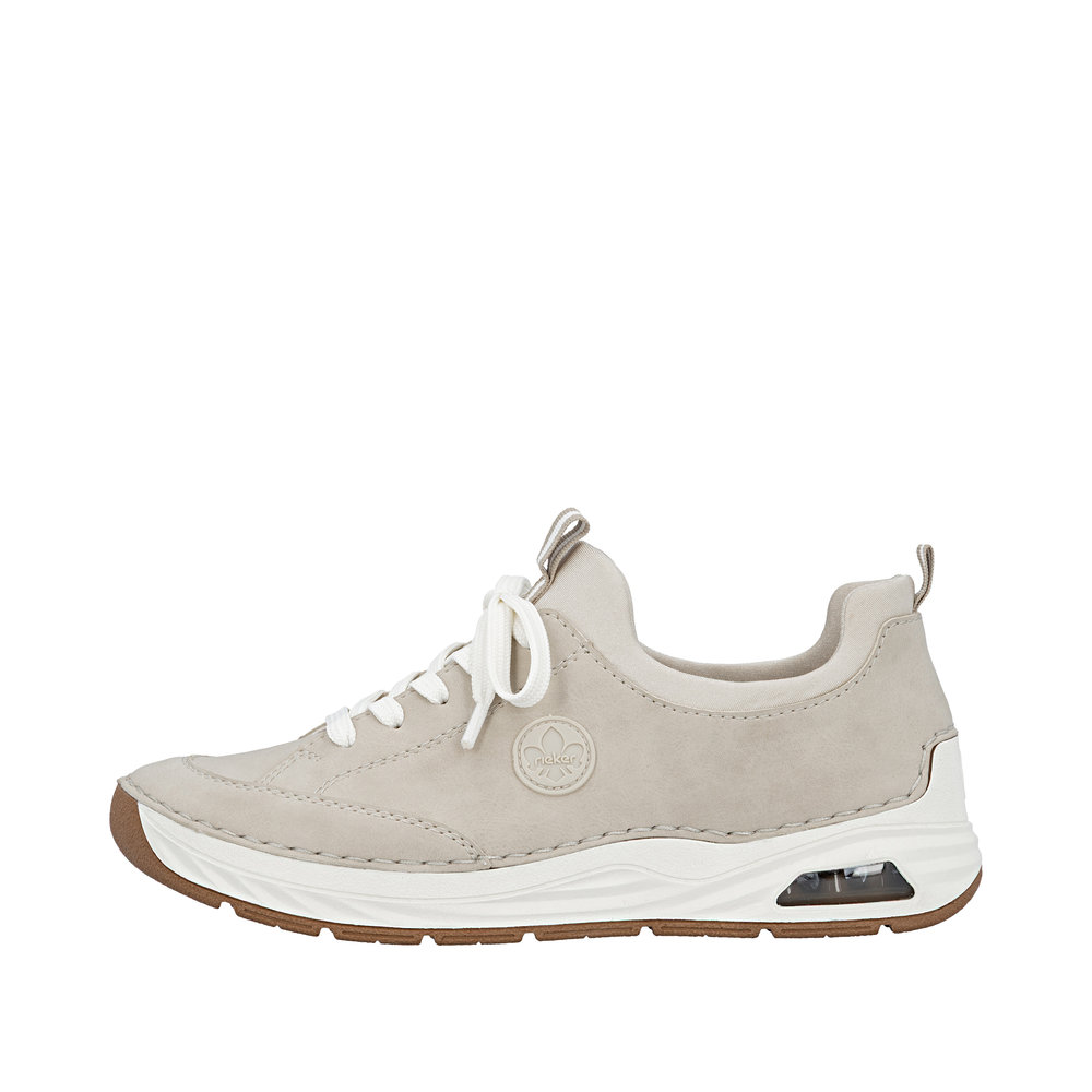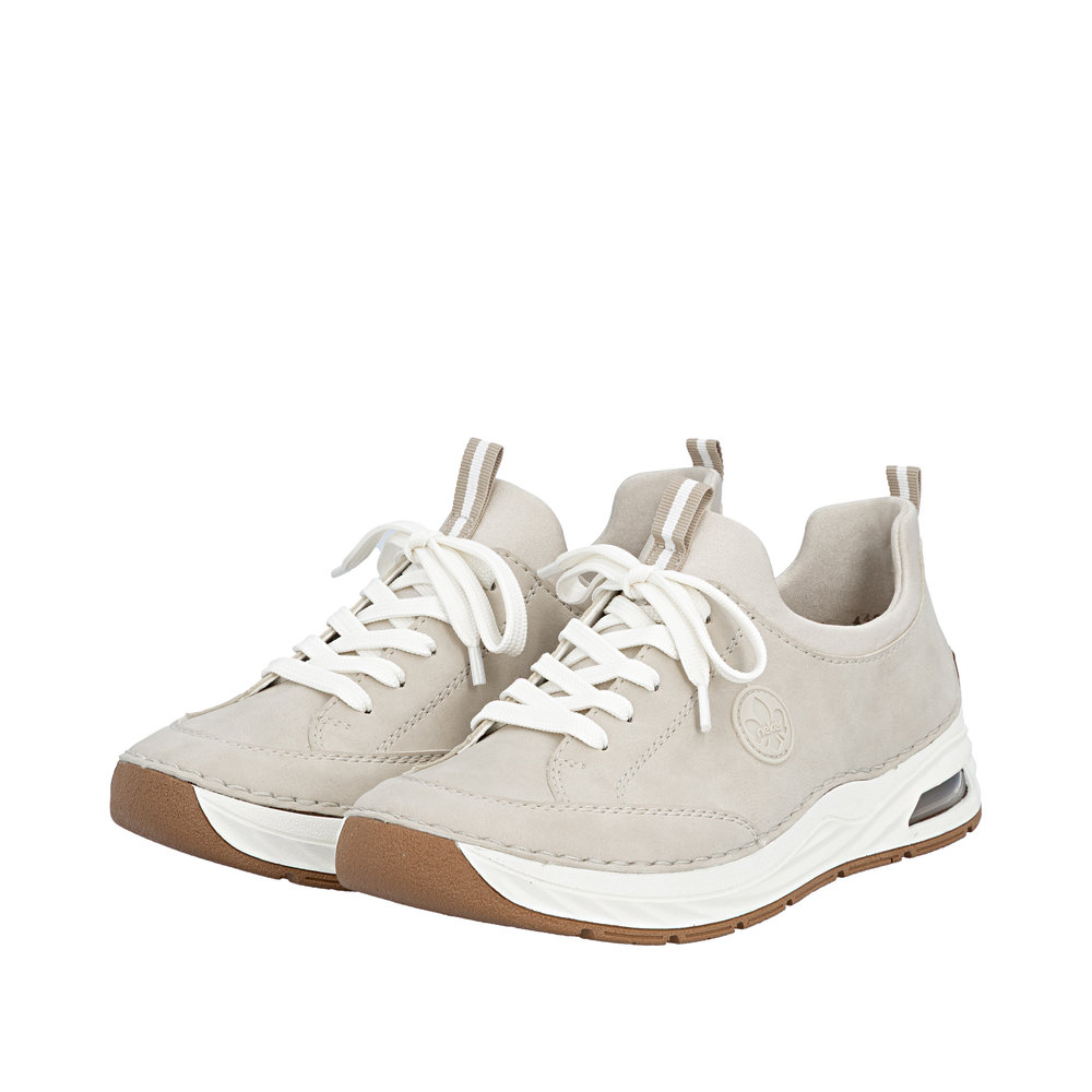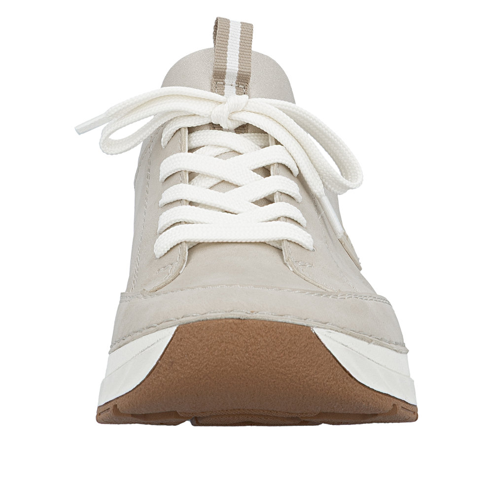 Rieker sneakers til dame i beige. Smarte sneakers i en populær farve der kombinerer et moderne look med komfort til daglig brug. Snørebåndene foran gør det let at tilpasse skoen til foden og sikrer nem af og påtagning. Indvendigt er skoen udstyret med en blød skindsål, og Rieker-Air sålen sørger for stødabsorbering og behagelig komfort dagen lang. Under sålen finder du et mønster der giver øget skridsikkerhed ved daglig brug.