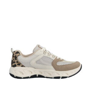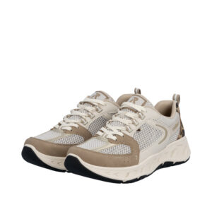 Rieker sneakers til dame i beige kombi. Flot og sporty sko i let netmateriale, der giver en behagelig og luftig fornemmelse. De justerbare snørebånd gør det let at opnå en god pasform. Skoen er udstyret med en blød, udtagelig indersål, som sikrer komfort hele dagen. Med ekstra bredde G får foden god plads. Ydersålen har et markant mønster, der bidrager til stødabsorbering og en behagelig gang.