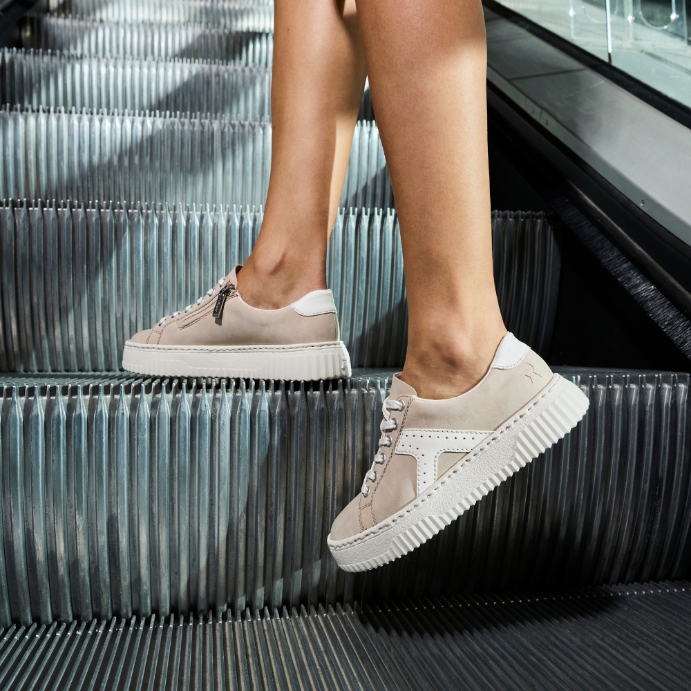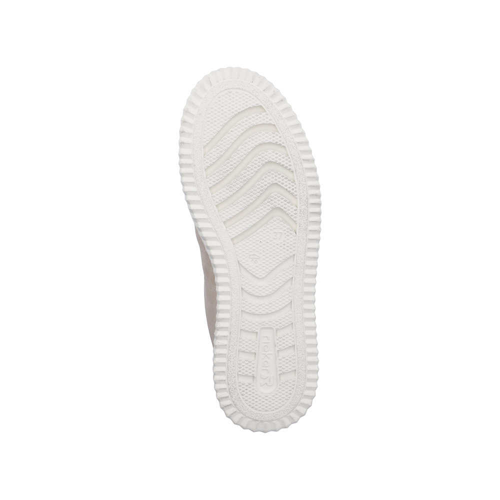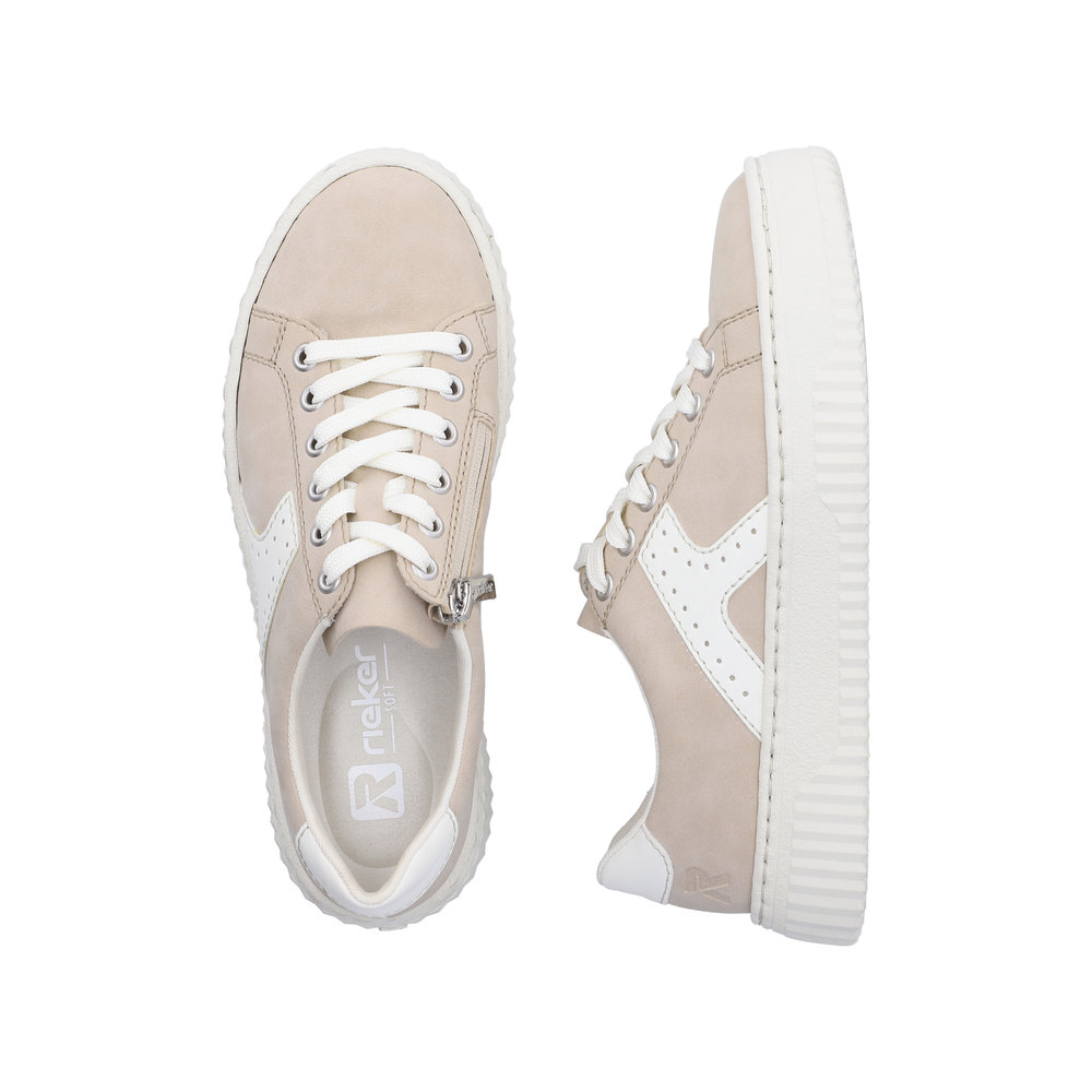 Rieker sneakers til dame i beige. Disse moderne sneakers kombinerer praktiske detaljer med et stilrent look, der passer perfekt til hverdagen. Skoen har snørebånd samt en funktionel lynlås, der gør den let at bruge og nem at tilpasse til foden. Indvendigt er modellen udstyret med en blød udtagelig indersål, som sikrer god komfort dagen igennem. Den mønstrede ydersål giver både øget støtte og skridsikkerhed.