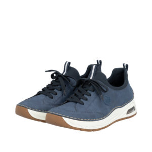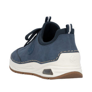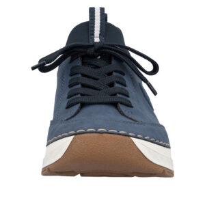 Rieker sneakers til dame i blå. Populær sneakers i en frisk blå farve med enkle detaljer der giver et nutidigt og let udtryk. Skoen lukkes med snørebånd foran som gør det nemt at justere pasformen og tage skoen af og på. Indvendigt er skoen udstyret med en blød skindsål, mens den stødabsorberende Rieker-Air sål giver god støtte og komfort gennem hele dagen. Ydersålen har et godt mønster som bidrager til øget skridsikkerhed i hverdagen.