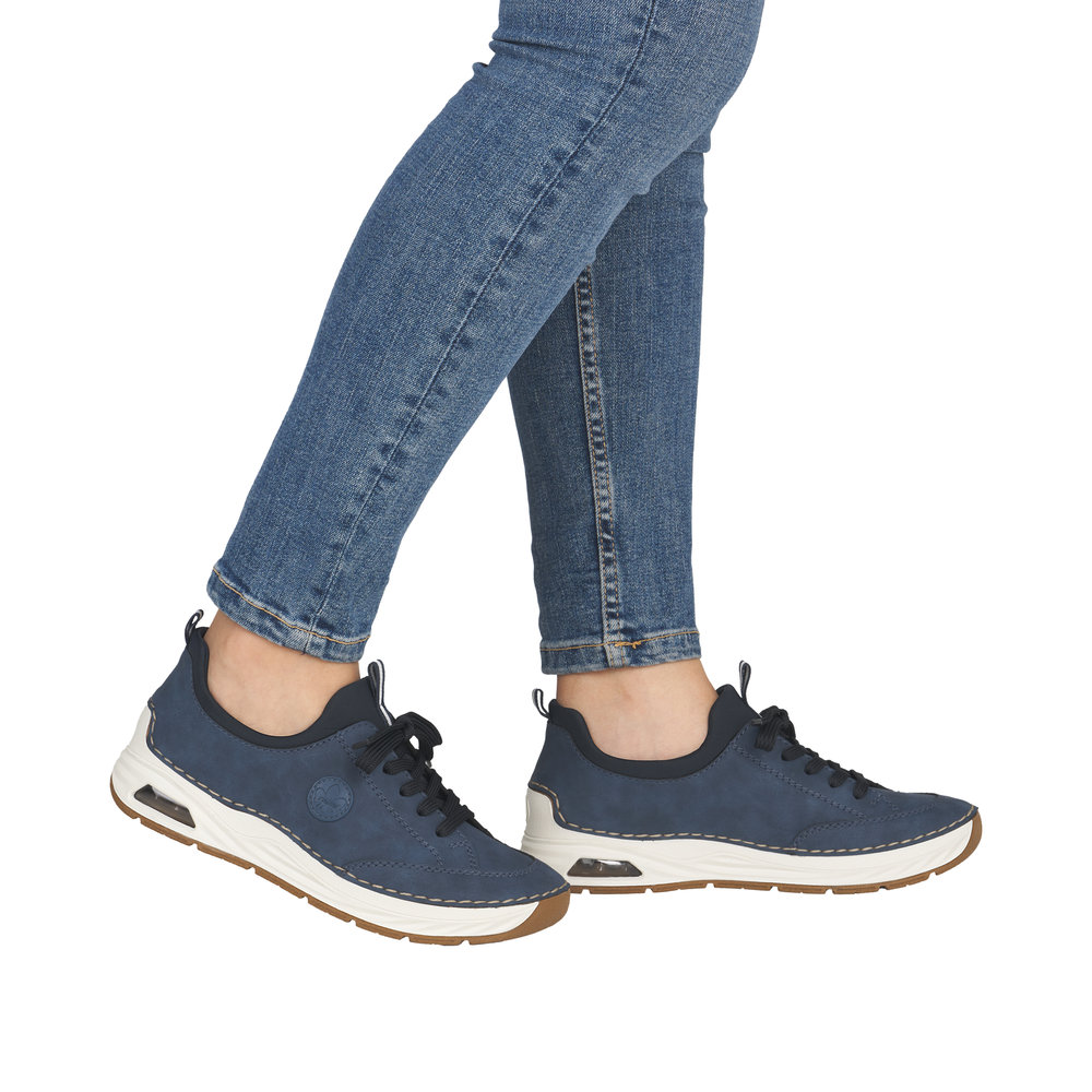 Rieker sneakers til dame i blå. Populær sneakers i en frisk blå farve med enkle detaljer der giver et nutidigt og let udtryk. Skoen lukkes med snørebånd foran som gør det nemt at justere pasformen og tage skoen af og på. Indvendigt er skoen udstyret med en blød skindsål, mens den stødabsorberende Rieker-Air sål giver god støtte og komfort gennem hele dagen. Ydersålen har et godt mønster som bidrager til øget skridsikkerhed i hverdagen.