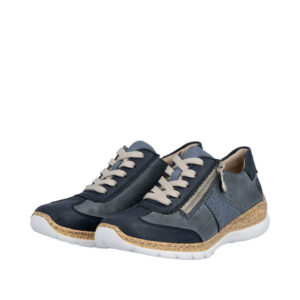 Rieker sneakers til dame i blå. Moderne sneakers i blå med et let og fleksibelt design samt fine detaljer. Snørebåndene foran hjælper med at tilpasse pasformen efter foden, og den funktionelle lynlås gør det hurtigt at komme i og af skoen. Indvendigt er skoen udstyret med en blød Memosoft indersål som former sig efter foden og sikrer god pasform. Den stødabsorberende opbygning giver komfort, mens Rieker sålen med et godt mønster bidrager til øget skridsikkerhed.