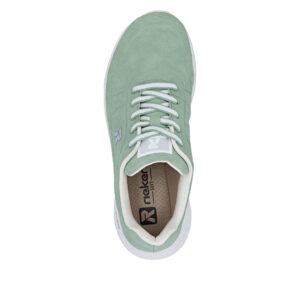 Rieker sneakers til dame i grøn. Smarte grønne sneakers med fokus på komfort og et moderne hverdagslook. Snørebåndene foran gør det let at tilpasse skoen til foden og giver nem af- og påtagning. Indvendigt finder du en blød, udtagelig Rieker-Soft sål som giver behagelig komfort dagen lang. Den lette og fleksible Rieker-Light+ sål er stødabsorberende og bidrager til god støtte og komfort gennem hele dagen.