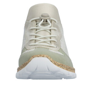 Rieker sneakers til dame i hvid farvekombination. Disse sneakers i hvid kombinerer en lys farve med grønne og gyldne detaljer. Elastikken foran kan justeres og gør det let at opnå en god pasform. Indvendigt finder du en blød Memosoft indersål som følger foden og giver en behagelig oplevelse gennem hele dagen. Ydersålen er let, fleksibel og stødabsorberende, hvilket giver støtte og komfort i hverdagen.