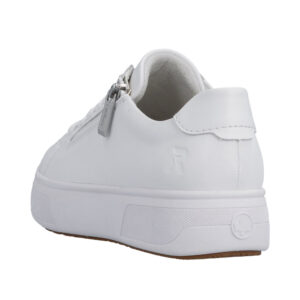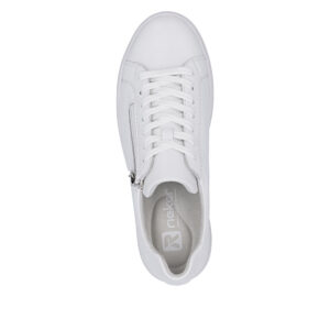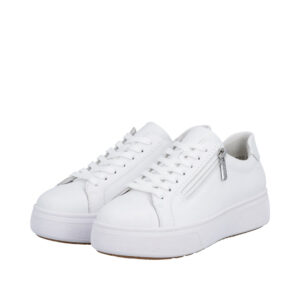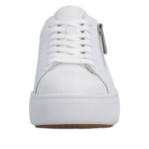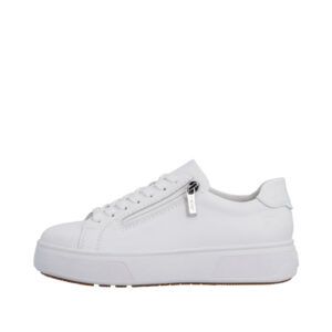 Rieker sneakers til dame i hvid. Smarte hvide sneakers med et enkelt og moderne look. Snørebåndene foran hjælper med at tilpasse skoen til foden, mens den funktionelle lynlås på ydersiden gør skoen nem at tage af og på. Indvendigt finder du en blød og udtagelig Rieker Soft indersål der giver høj komfort. Den solide plateausål på 4 cm. er udstyret med stødabsorbering for ekstra komfort, og gummiydersålen bidrager til øget skridsikkerhed.
