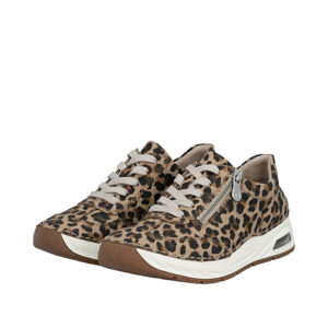 Rieker sneakers til dame i leopard. Stilfuld og moderne sko med leopardoverdel og fine detaljer, der giver et moderne udtryk. Kombinationen af snørebånd og funktionel lynlås gør skoen praktisk i brug og nem at tilpasse til foden. Indvendigt har skoen en blød skindindersål, som giver en behagelig komfort dagen igennem. Den mønstrede ydersål giver øget stødabsorbering og skridsikkerhed ved hvert skridt.
